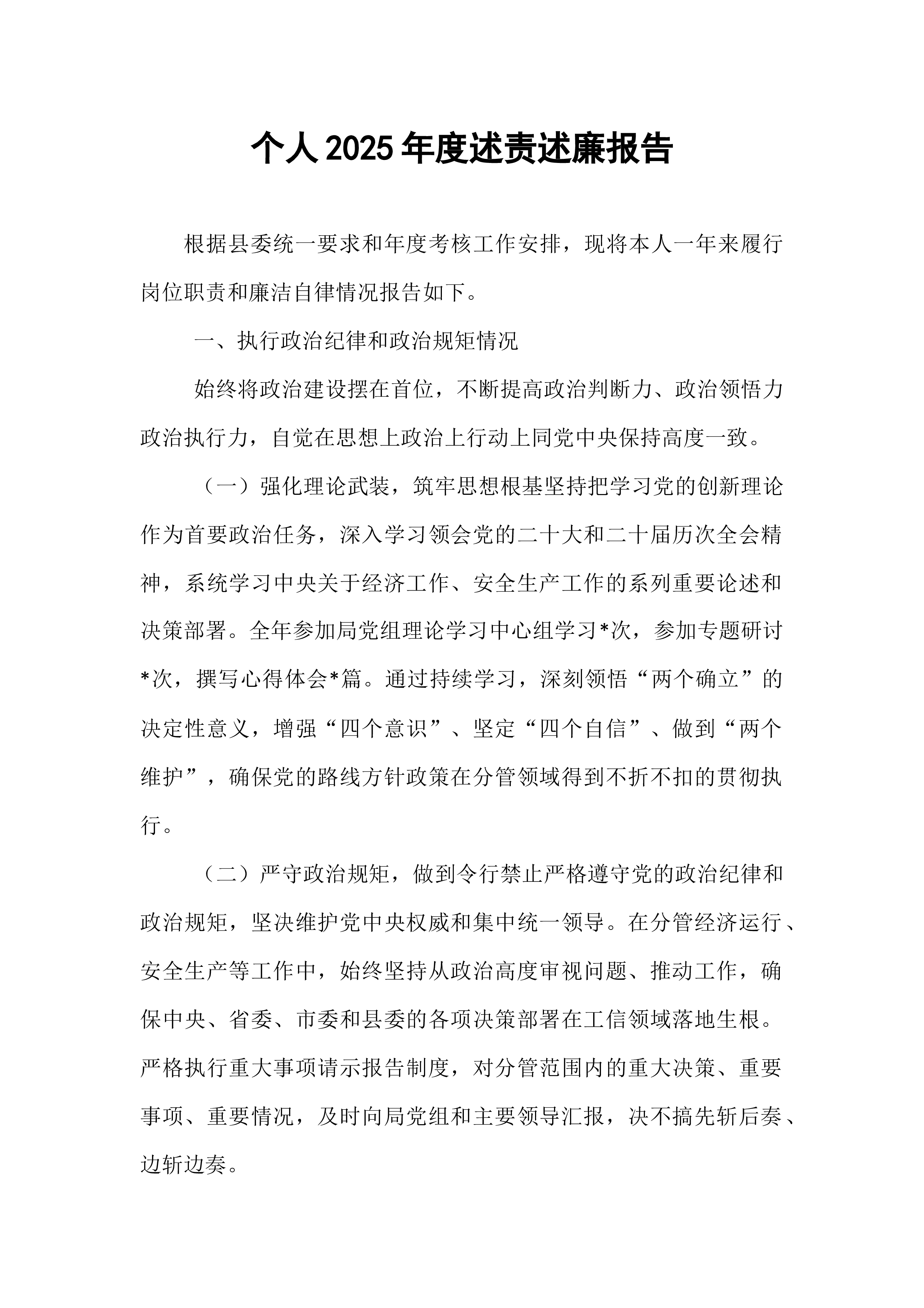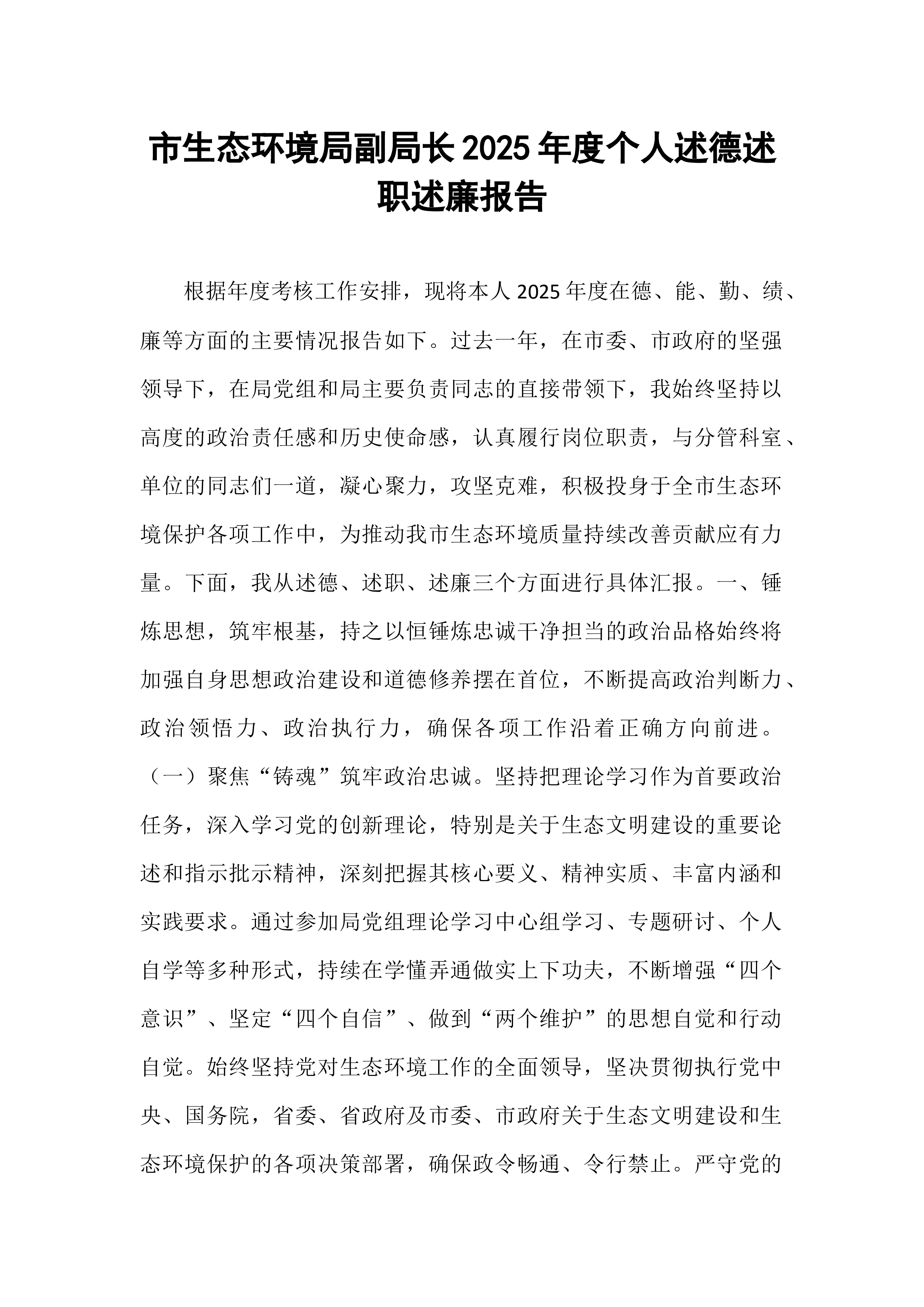 市生态环境局副局长2025年度个人述德述职述廉报告根据年度考核工作安排,现将本人2025年度在德、能、勤、绩、廉等方面的主要情况报告如下。过去一年,在市委、市政府的坚强领导下,在局党组和局主要负责同志的直接带领下,我始终坚持以高度的政治责任感和历史使命感,认真履行岗位职责,与分管科室、单位的同志们一道,凝心聚力,攻坚克难,积极投身于全市生态环境保护各项工作中,为推动我市生态环境质量持续改善贡献应有力量。下面,我从述德、述职、述廉三个方面进行具体汇报。一、锤炼思想,筑牢根基,持之以恒锤炼忠诚干净担当的政治品格始终将加强自身思想政治建设和道德修养摆在首位,不断提高政治判断力、政治领悟力、政治执行力,确保各项工作沿着正确方向前进。(一)聚焦“铸魂”筑牢政治忠诚。坚持把理论学习作为首要政治任务,深入...