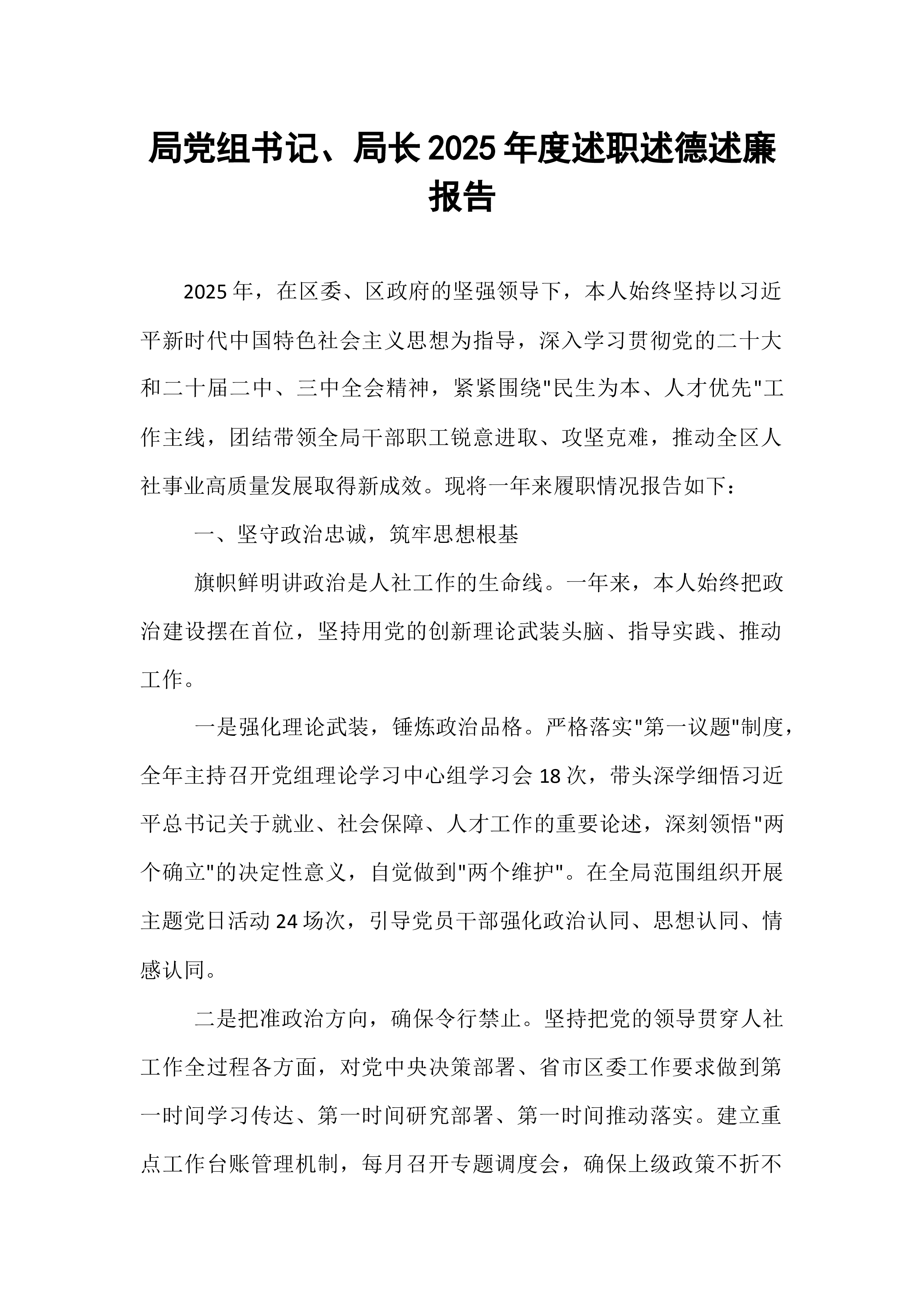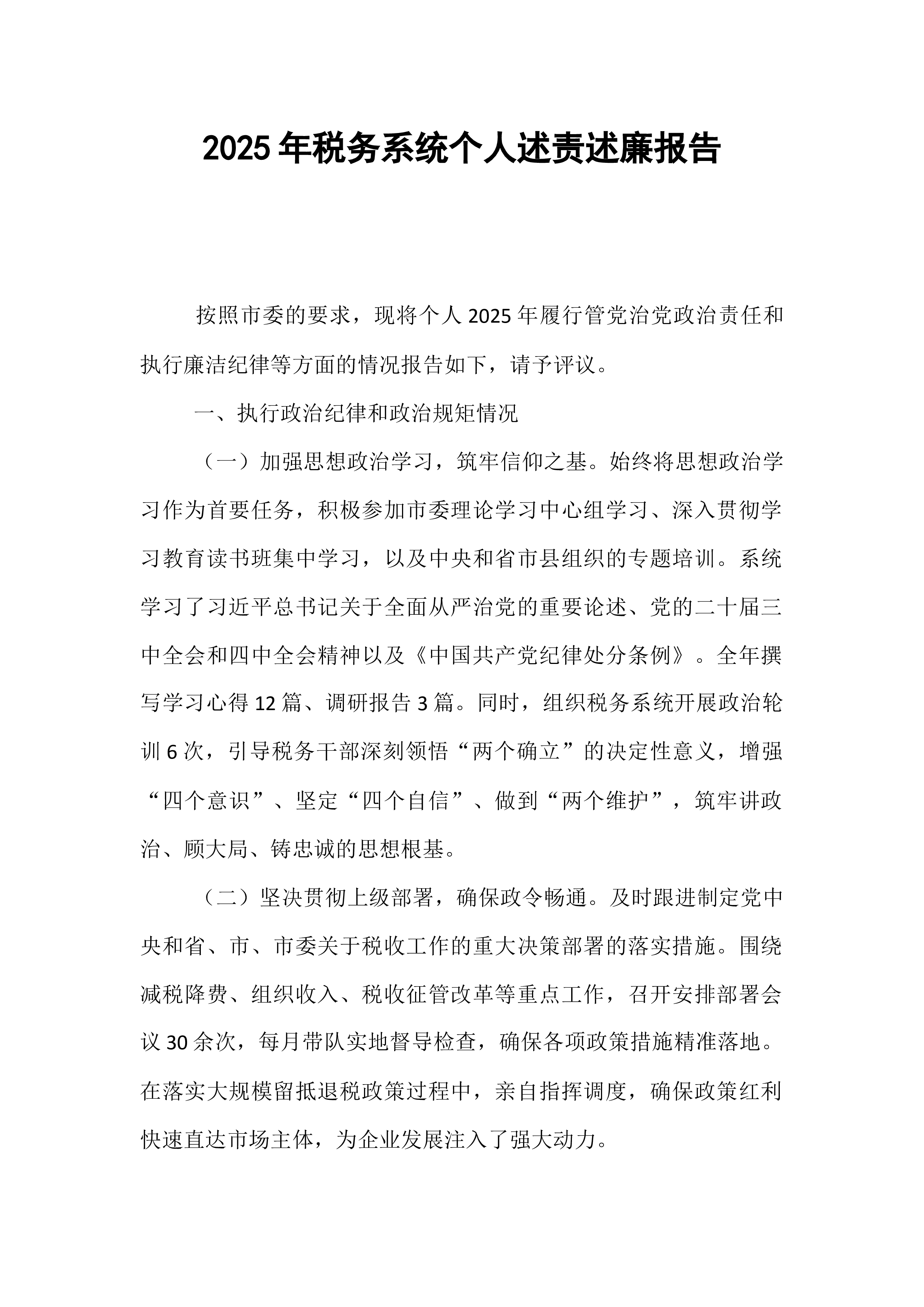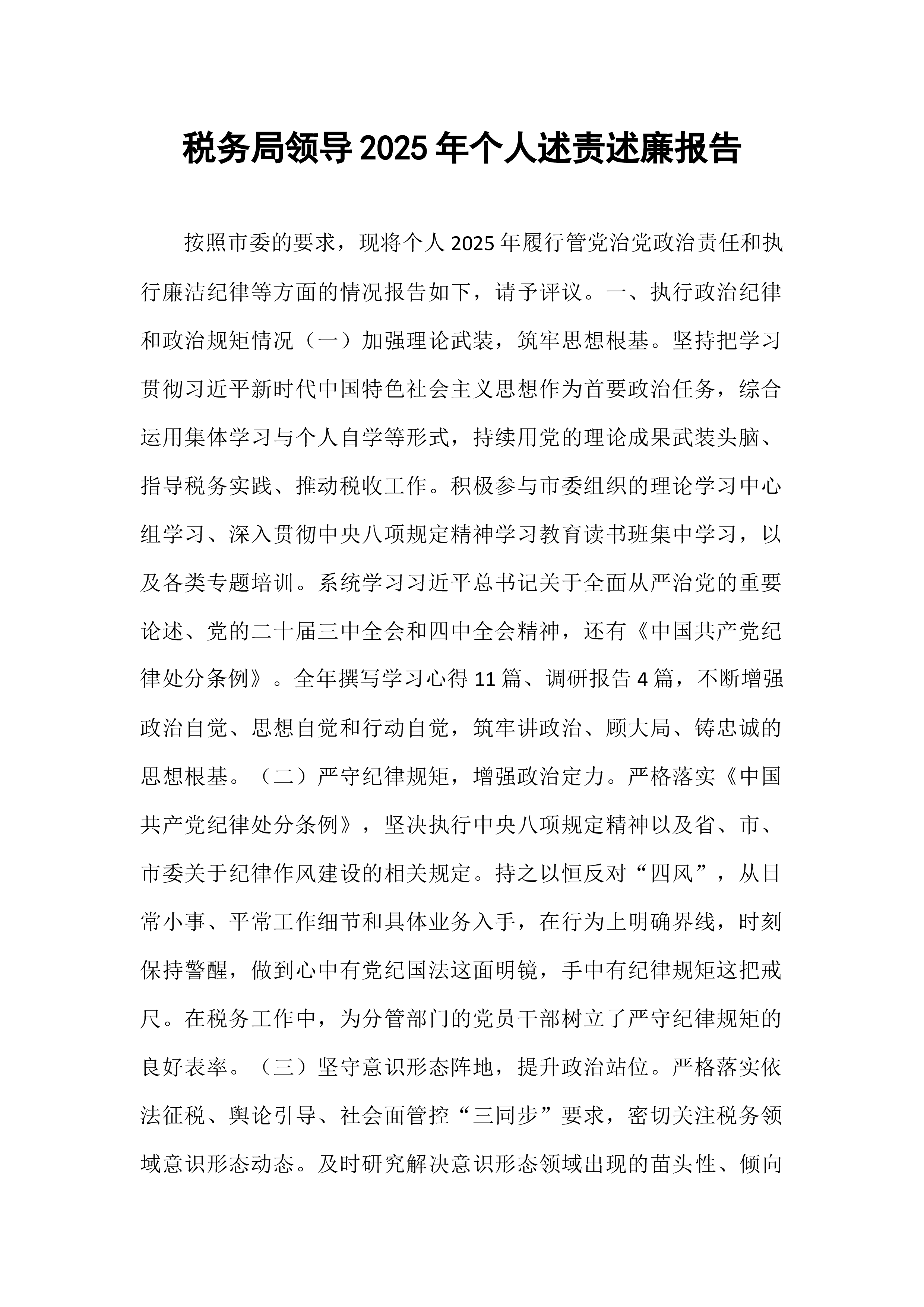 2025年度税务局党组织书记述职述廉报告尊敬的各位领导、同志们:过去一年,在上级党委的坚强领导下,我作为税务局党组织书记,始终以习近平新时代中国特色社会主义思想为指导,深入贯彻党的二十大精神,严格履行党建工作第一责任人职责,扎实推进党组织建设、党员管理和党风廉政建设等工作。现将全年工作与廉洁情况述职如下:一、强基固本抓党建,筑牢税务战斗堡垒(一)建强组织体系,不断夯实税务党建根基。围绕“支部标准化规范化建设”目标,我牵头完善税务局党组织架构,细化党委委员分工,明确责任清单,确保党建工作“有人抓、有人管、有落实”。全年共组织党委会12次,专题研究党建工作8次,针对党员年龄结构、知识层次等问题制定优化方案3项。同时,规范党组织阵地建设,更新党员活动室宣传展板6块,补充税务党建相关书籍200余册,...