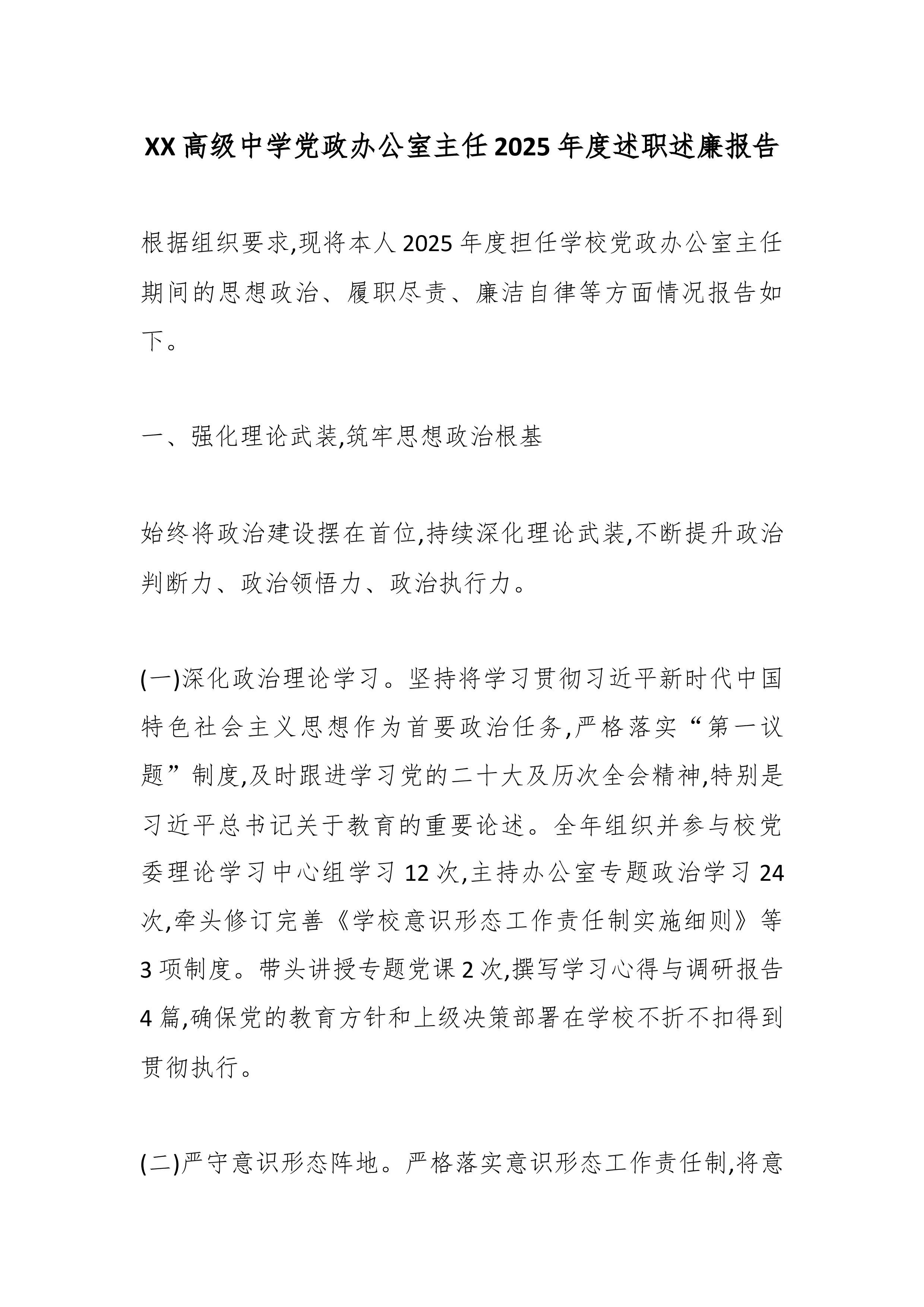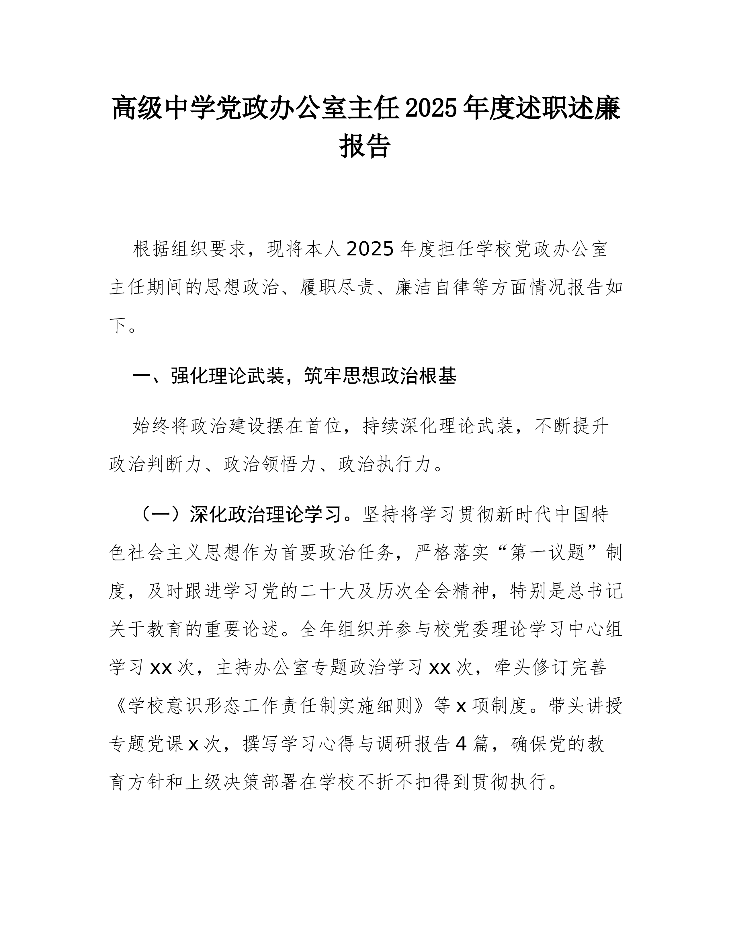 XX高级中学党政办公室主任2025年度述职述廉报告根据组织要求,现将本人2025年度担任学校党政办公室主任期间的思想政治、履职尽责、廉洁自律等方面情况报告如下。一、强化理论武装,筑牢思想政治根基始终将政治建设摆在首位,持续深化理论武装,不断提升政治判断力、政治领悟力、政治执行力。(一)深化政治理论学习。坚持将学习贯彻习近平新时代中国特色社会主义思想作为首要政治任务,严格落实“第一议题”制度,及时跟进学习党的二十大及历次全会精神,特别是习近平总书记关于教育的重要论述。全年组织并参与校党委理论学习中心组学习12次,主持办公室专题政治学习24次,牵头修订完善《学校意识形态工作责任制实施细则》等3项制度。带头讲授专题党课2次,撰写学习心得与调研报告4篇,确保党的教育方针和上级决策部署在学校不折不扣得...