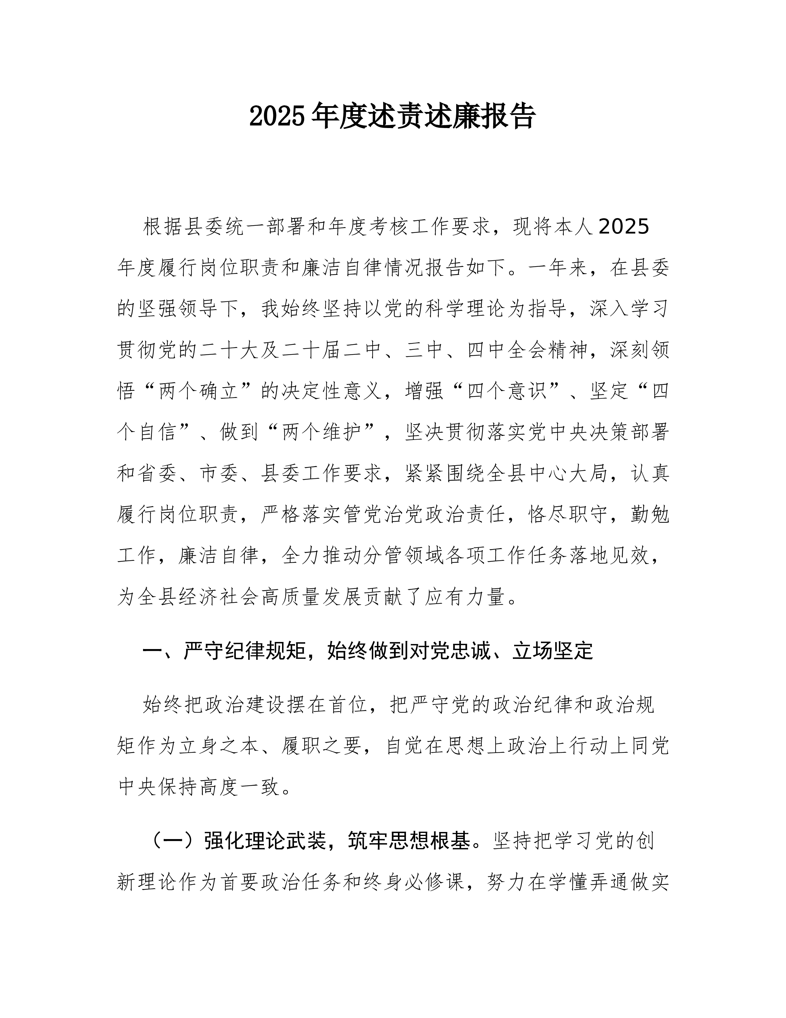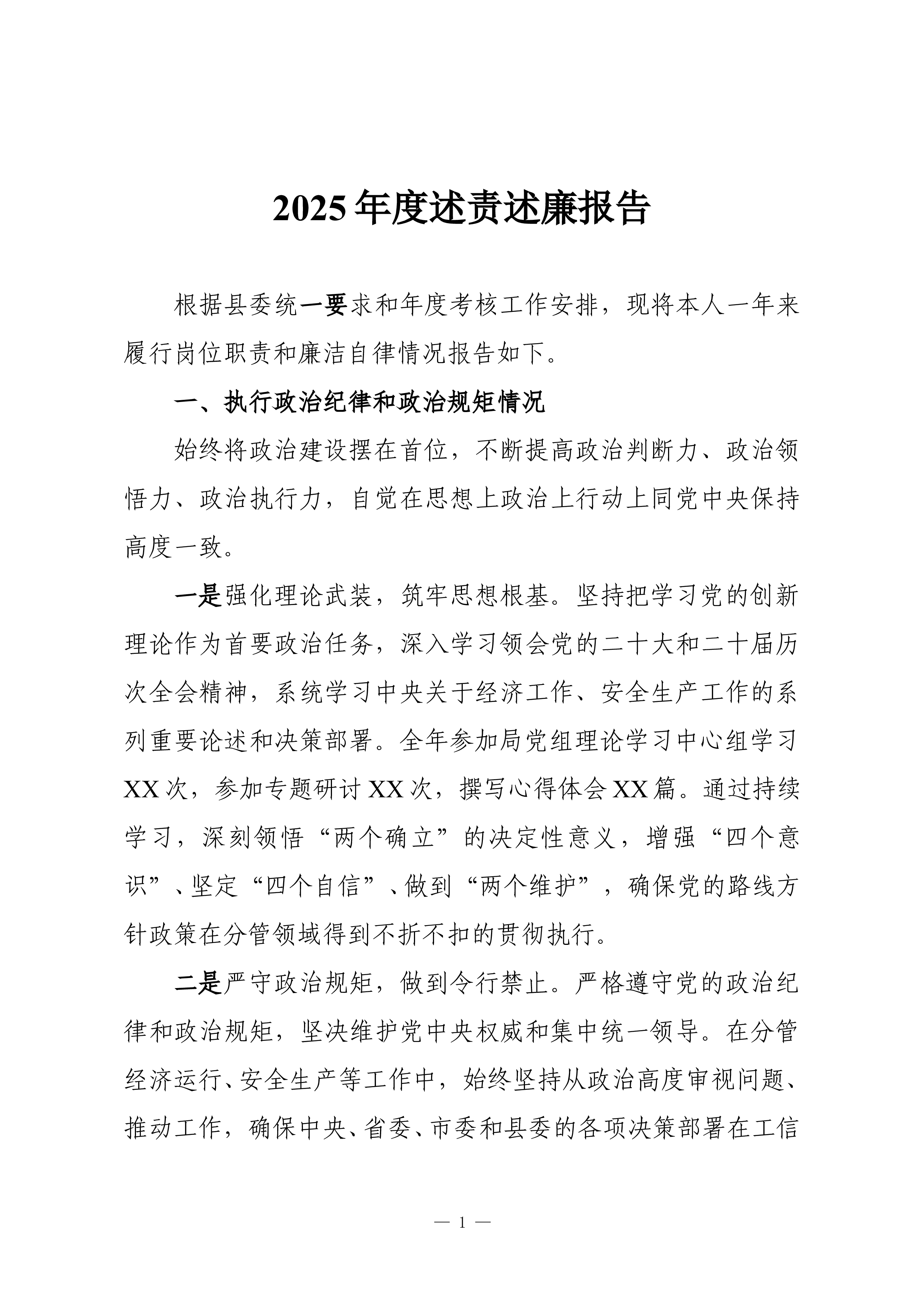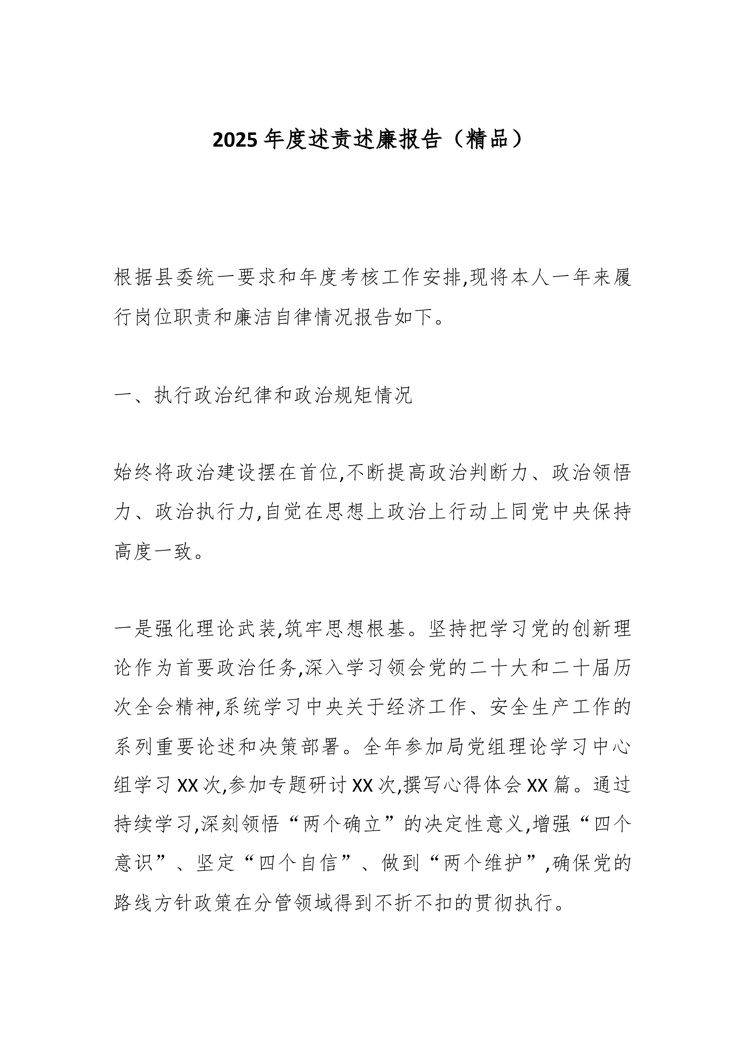 2025年度述责述廉报告(精品)根据县委统一要求和年度考核工作安排,现将本人一年来履行岗位职责和廉洁自律情况报告如下。一、执行政治纪律和政治规矩情况始终将政治建设摆在首位,不断提高政治判断力、政治领悟力、政治执行力,自觉在思想上政治上行动上同党中央保持高度一致。一是强化理论武装,筑牢思想根基。坚持把学习党的创新理论作为首要政治任务,深入学习领会党的二十大和二十届历次全会精神,系统学习中央关于经济工作、安全生产工作的系列重要论述和决策部署。全年参加局党组理论学习中心组学习XX次,参加专题研讨XX次,撰写心得体会XX篇。通过持续学习,深刻领悟“两个确立”的决定性意义,增强“四个意识”、坚定“四个自信”、做到“两个维护”,确保党的路线方针政策在分管领域得到不折不扣的贯彻执行。二是严守政治规矩,做到...