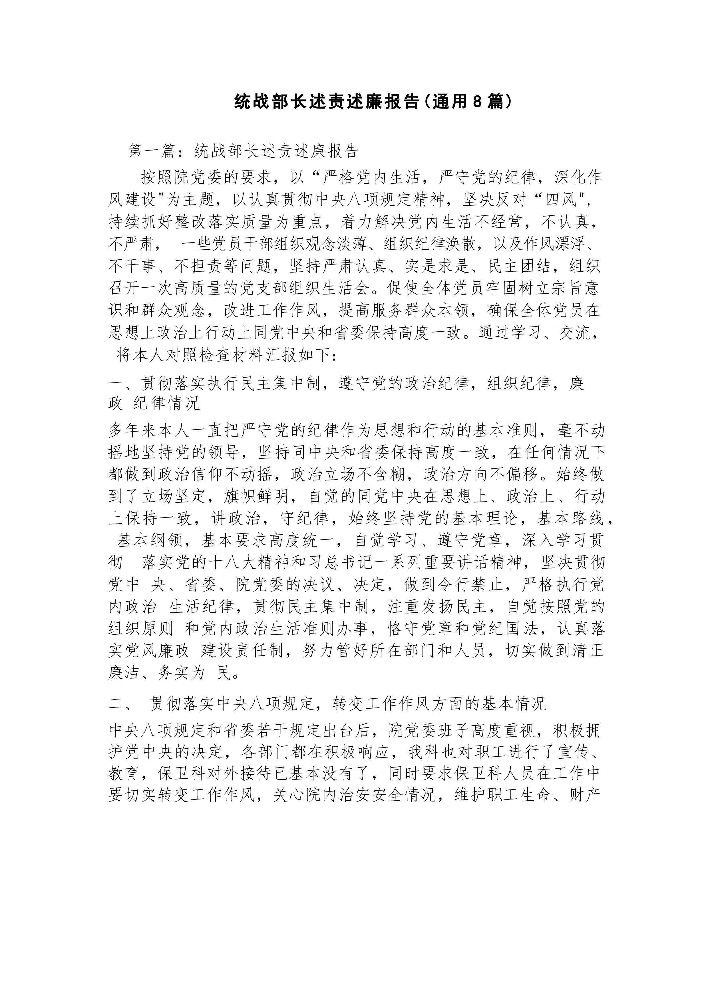 统战部长述责述廉报告(通用8篇)第一篇:统战部长述责述廉报告按照院党委的要求,以“严格党内生活,严守党的纪律,深化作风建设"为主题,以认真贯彻中央八项规定精神,坚决反对“四风",持续抓好整改落实质量为重点,着力解决党内生活不经常,不认真,不严肃,一些党员干部组织观念淡薄、组织纪律涣散,以及作风漂浮、不干事、不担责等问题,坚持严肃认真、实是求是、民主团结,组织召开一次高质量的党支部组织生活会。促使全体党员牢固树立宗旨意识和群众观念,改进工作作风,提高服务群众本领,确保全体党员在思想上政治上行动上同党中央和省委保持高度一致。通过学习、交流,将本人对照检查材料汇报如下:一、贯彻落实执行民主集中制,遵...