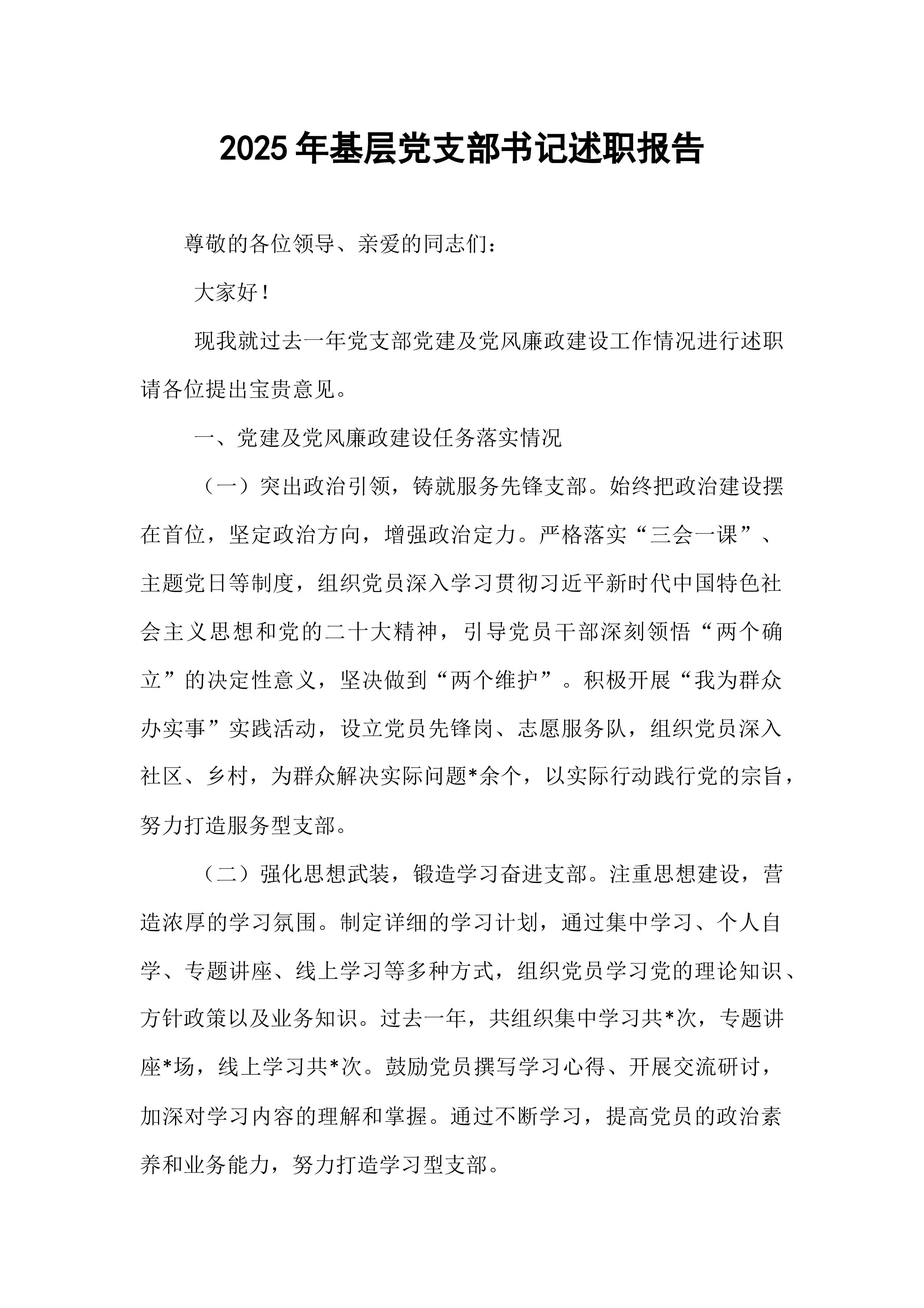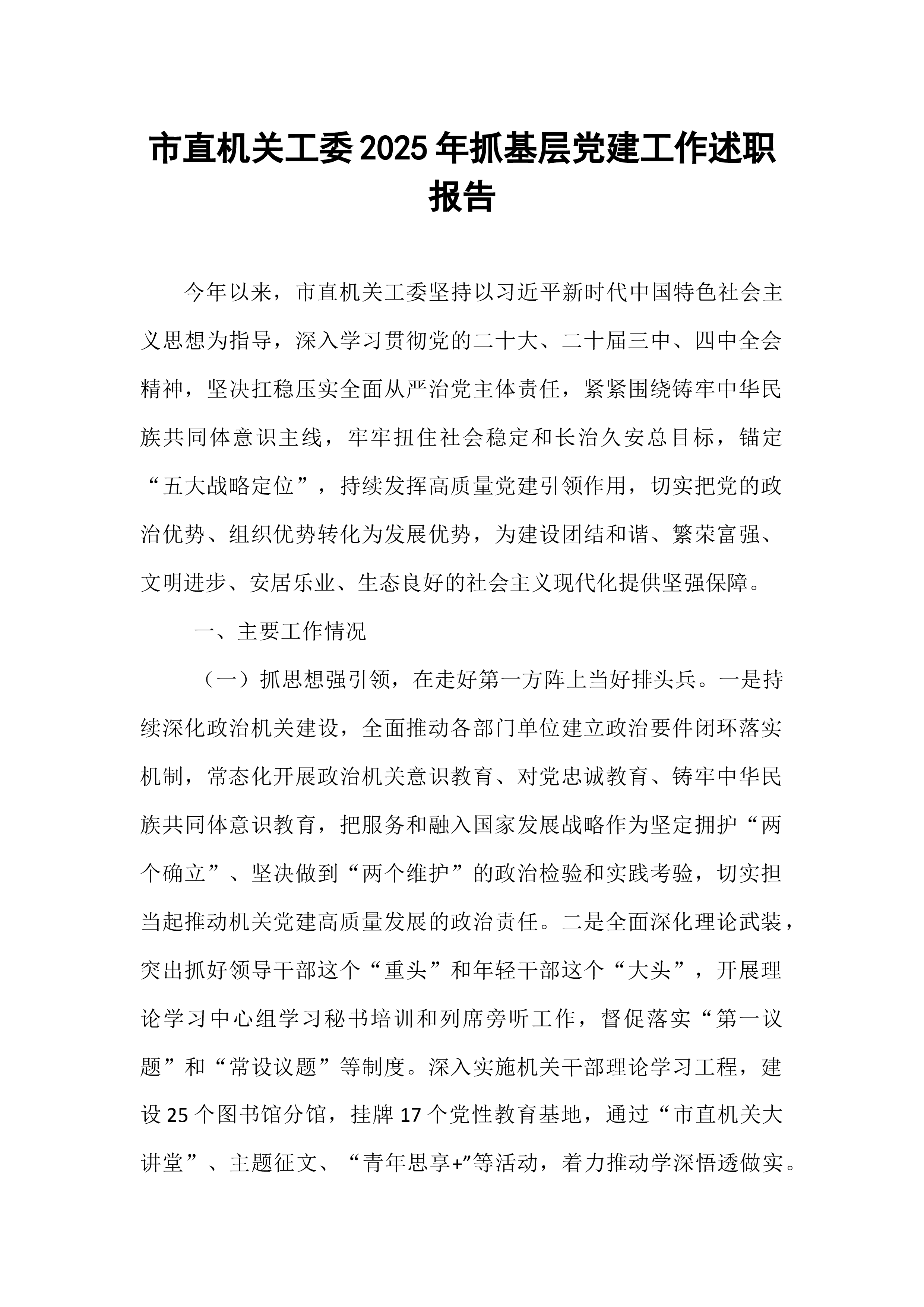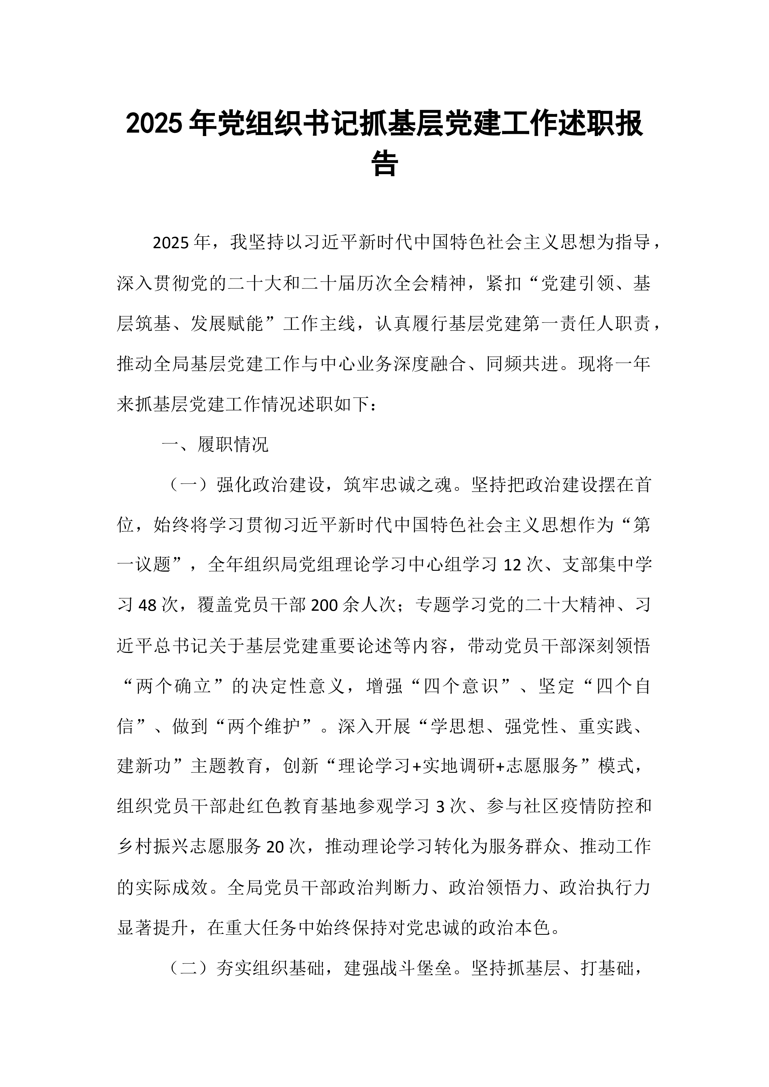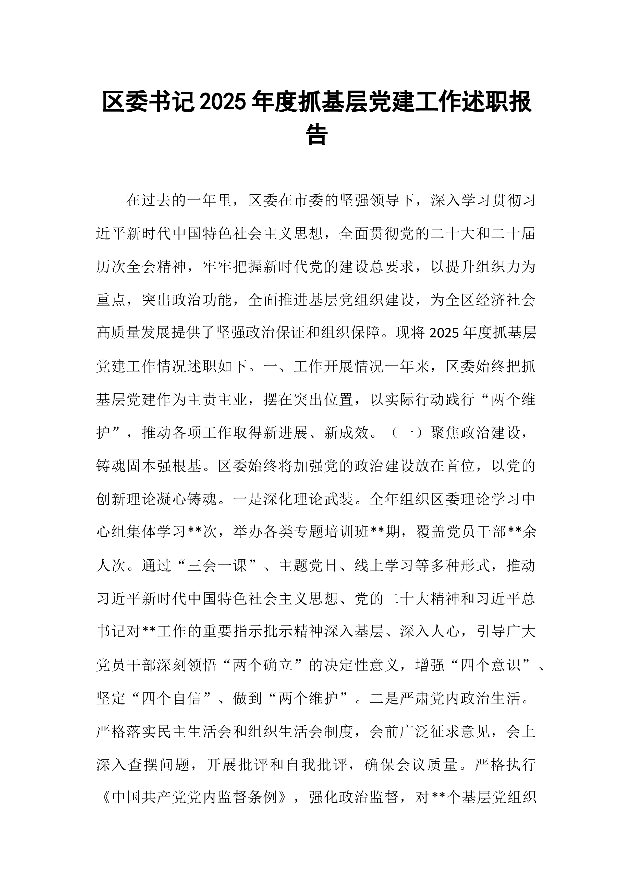 区委书记2025年度抓基层党建工作述职报告在过去的一年里,区委在市委的坚强领导下,深入学习贯彻习近平新时代中国特色社会主义思想,全面贯彻党的二十大和二十届历次全会精神,牢牢把握新时代党的建设总要求,以提升组织力为重点,突出政治功能,全面推进基层党组织建设,为全区经济社会高质量发展提供了坚强政治保证和组织保障。现将2025年度抓基层党建工作情况述职如下。一、工作开展情况一年来,区委始终把抓基层党建作为主责主业,摆在突出位置,以实际行动践行“两个维护”,推动各项工作取得新进展、新成效。(一)聚焦政治建设,铸魂固本强根基。区委始终将加强党的政治建设放在首位,以党的创新理论凝心铸魂。一是深化理论武装。全年组织区委理论学习中心组集体学习**次,举办各类专题培训班**期,覆盖党员干部**余人次。通过“三...