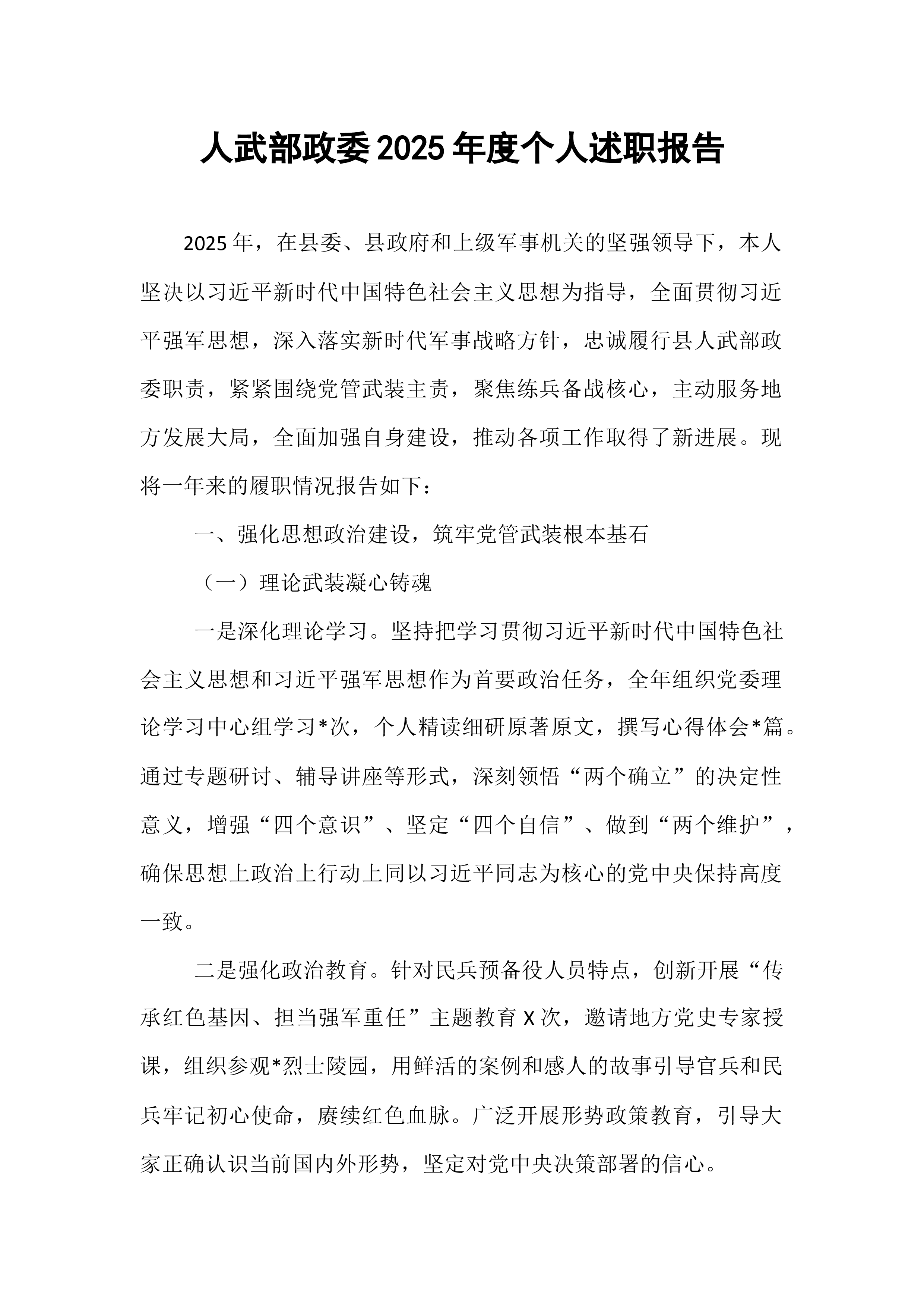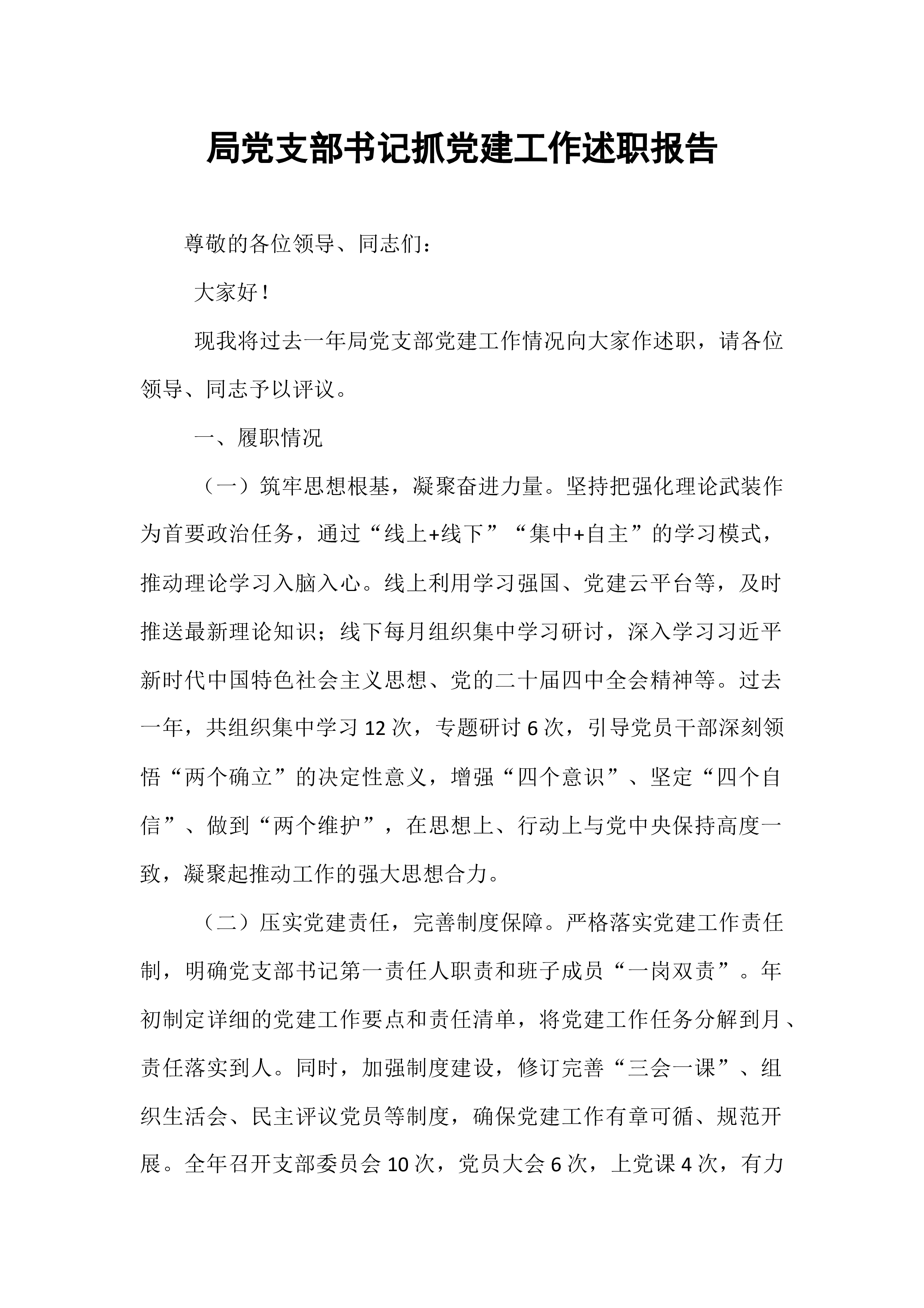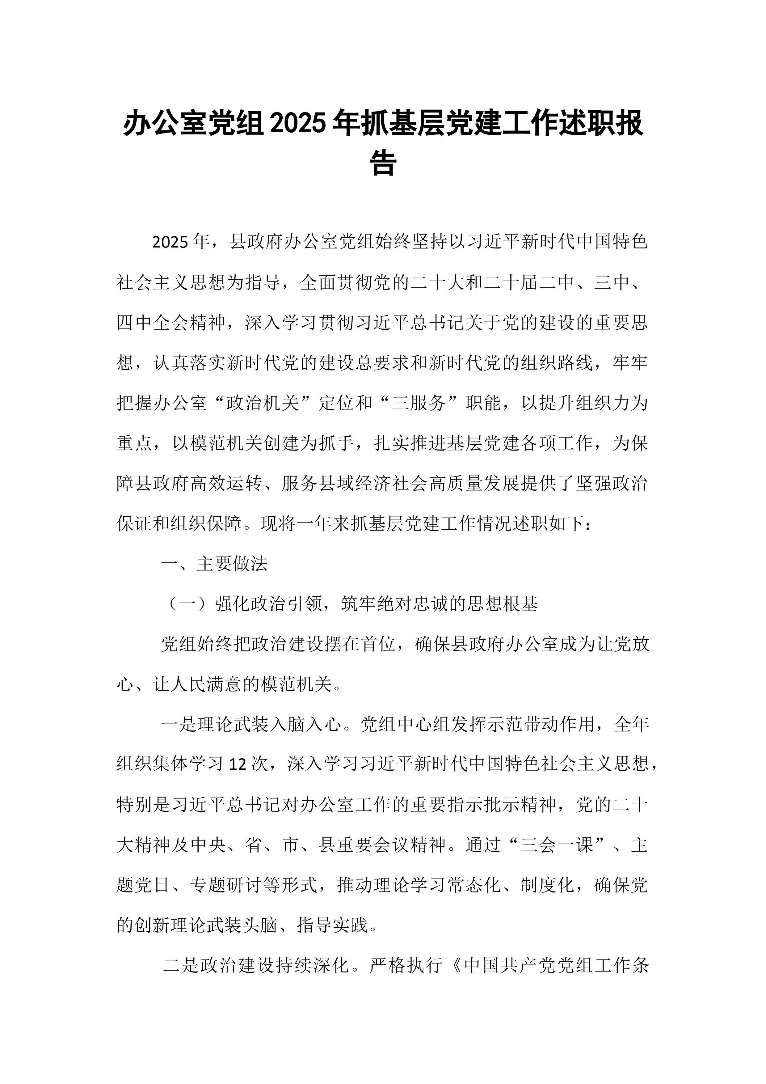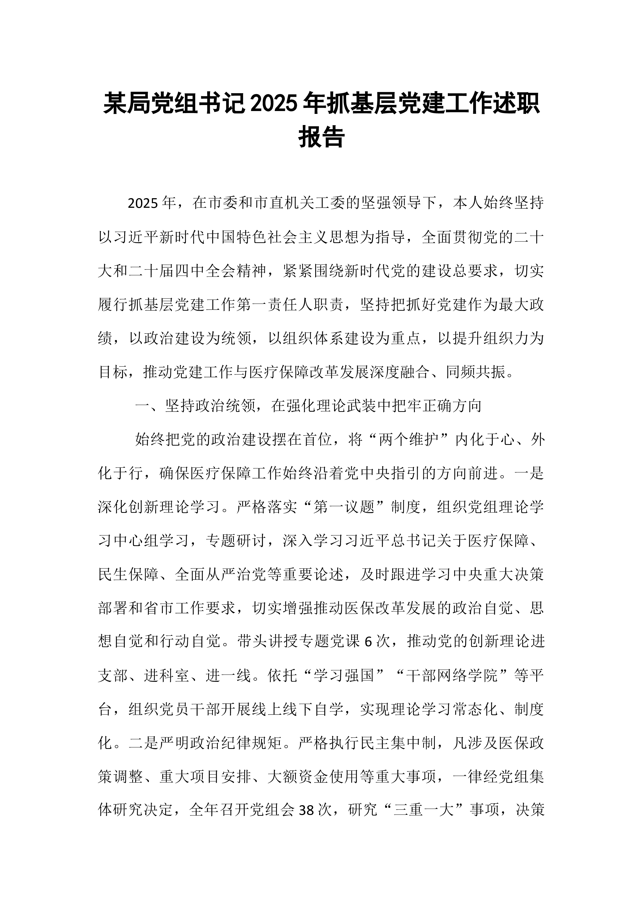 区委书记2025年度抓基层党建工作述职报告在过去的一年里,区委在市委的坚强领导下,深入学习贯彻习近平新时代中国特色社会主义思想,全面贯彻党的二十大和二十届历次全会精神,牢牢把握新时代党的建设总要求,以提升组织力为重点,突出政治功能,全面推进基层党组织建设,为全区经济社会高质量发展提供了坚强政治保证和组织保障。现将2025年度抓基层党建工作情况述职如下。一、工作开展情况一年来,区委始终把抓基层党建作为主责主业,摆在突出位置,以实际行动践行“两个维护”,推动各项工作取得新进展、新成效。(一)聚焦政治建设,铸魂固本强根基。区委始终将加强党的政治建设放在首位,以党的创新理论凝心铸魂。一是深化理论武装。全年组织区委理论学习中心组集体学习**次,举办各类专题培训班**期,覆盖党员干部**余人次。通过“三...