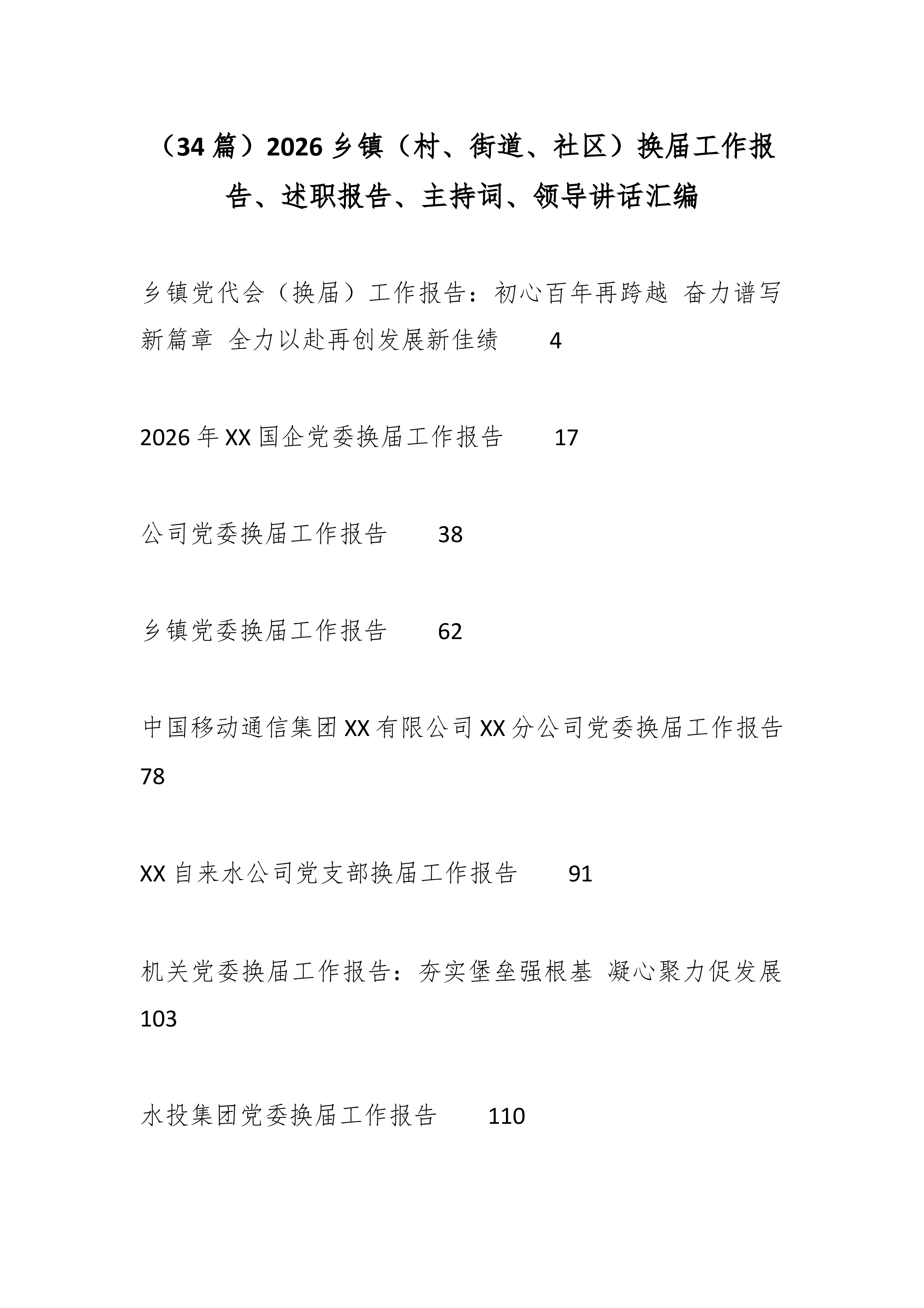 (34篇)2026乡镇(村、街道、社区)换届工作报告、述职报告、主持词、领导讲话汇编