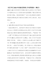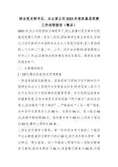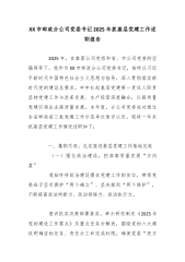 综合党支部书记、办公室主任2025年度抓基层党建工作述职报告(精品)2025年,在公司党委的正确领导下,我认真履行党支部书记抓基层党建工作第一责任人职责,团结带领支部全体党员,坚持以习近平新时代中国特色社会主义思想为指导,深入贯彻党的二十大和二十届二中、三中、四中全会精神,紧紧围绕公司中心工作,扎实推进支部党建各项任务落实。现将有关情况报告如下:一、主要履职情况(一)强化理论武装,筑牢思想根基一是深学细悟创新理论。坚持把学习贯彻习近平新时代中国特色社会主义思想作为首要政治任务,特别是深入学习习近平总书记关于党的建设的重要思想、关于党的自我革命的重要思想,引导支部党员深刻领悟“两个确立”的决定性意义,坚决做到“两个维护”。严格落实“三会一课”制度,全年召开支部党员大会XX次、支委会XX次、党小...