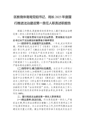 区教育体育局党组书记、局长2025年度履行推进法治建设第一责任人职责述职报告根据工作要求,现就教育体育局和本人履行推进法治建设第一责任人职责情况及学法用法情况报告如下:一、学习宣传贯彻习近平法治思想、贯彻落实习近平总书记关于法治建设的重要指示精神情况(一)坚持学习,全面提升法治素养。一年来,充分利用书籍、网络等途径,先后学习了《党章》《党的二十大精神解读》等文件,自学了《廉洁从政若干准则》《中国共产党纪律处分条例》《中国共产党问责条例》《宪法》《监察法》《义务教育法》等法律法规。特别是重点深入学习了二十届四中全会精神,充分体会了“依法治国”的重大意义,不断提高了个人法治意识。工作中严格按照法律法规办事,严格杜绝违法操作,违规运行。(二)指导学习,着力提升队伍素质。全区各中小学校以学校党组织为...