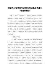 市委办公室党组书记2025年抓基层党建工作述职报告2025年,在市委的坚强领导下,我始终坚持以习近平新时代中国特色社会主义思想为指导,深入学习贯彻党的二十大和二十届三中、四中全会精神,全面落实习近平总书记视察我省重要讲话重要指示精神和关于新时代办公厅工作的重要指示精神,牢牢把握“围绕中心、建设队伍、服务群众”的职责定位,坚决扛起抓基层党建第一责任人责任,着力提升机关党的建设质量,以高质量党建引领保障“三服务”工作提质增效,努力当好市委的“坚强前哨”和“巩固后院”。一、主要工作情况(一)聚焦主责主业,筑牢政治忠诚根基,坚决做到“两个维护”。始终把党的政治建设摆在首位,教育引导全办党员干部深刻领悟“两个确立”的决定性意义,增强“四个意识”、坚定“四个自信”、做到“两个维护”,确保党办工作始终沿着...