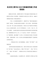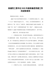 街道党工委书记2025年度抓基层党建工作的述职报告尊敬的各位领导、同志们:2025年是全面贯彻落实党的二十大精神的关键之年,也是“十五五”规划开局起步之年。一年来,在区委的坚强领导下,我始终牢记“第一责任人”的职责,将抓好党建作为最大的政绩,以党建“第一责任”引领和保障发展“第一要务”。根据会议安排,现将我个人2025年度抓基层党建工作的情况述职如下,请予评议。一、履职尽责,筑牢基层战斗堡垒(一)聚焦政治引领,带头提升理论武装。我坚持把理论学习作为履职的第一需要。带头深学党的二十届三中全会、四中全会精神,第一时间组织党工委理论学习中心组开展专题研讨,撰写题为《以改革创新破解基层治理难题》的心得体会,将全会精神与街道实际紧密结合。深入社区为基层党员讲授专题党课,确保精神直达“神经末梢”。将学习...