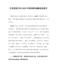 区局党组书记2025年度述职述廉述法报告根据区委统一安排和要求,现将本人2025年度履行岗位职责、遵守廉洁自律规定以及推进法治建设情况报告如下,请予评议。2025年来,在区委、区政府的坚强领导和市司法局的有力指导下,我始终坚持以新时代中国特色社会主义思想为指导,深入学习贯彻党的二十大和二十届二中、三中、四中全会精神,深刻领悟“两个确立”的决定性意义,增强“四个意识”、坚定“四个自信”、做到“两个维护”,紧紧围绕全区工作大局,团结带领全局干部职工,锚定“政治建局、法治立区、服务为民”目标,聚焦“一个统抓、五大职能”工作布局,深入实施“1134”工作计划,忠诚履职、担当作为、锐意进取、廉洁奉公,全力推动**区司法行政事业高质量发展,为全区经济社会发展提供了坚实的法治保障和优质的法律服务。一、聚焦...