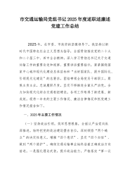 市交通运输局党组书记2025年度述职述廉述党建工作总结2025年,在市委、市政府的坚强领导下,我坚持以新时代中国特色社会主义思想为指导,全面贯彻落实党的二十大和二十届三中、四中全会精神,深入学习贯彻总书记关于交通运输工作的重要论述和视察、重要讲话重要指示,紧紧围绕国家中心城市现代化建设总体目标和“当好国家队、提升国际化、引领现代化建设”的总要求,团结带领全局党员干部职工,聚焦主责主业,忠诚履职尽责,坚定不移推进全面从严治党,全力加快现代化综合交通枢纽建设,各项工作取得了新进展、新成效。现将一年来的主要工作情况、廉洁自律情况和抓党建工作情况报告如下。一、2025年主要工作情况(一)坚持政治引领,筑牢思想根基,全面从严治党向纵深推进。始终把党的政治建设摆在首位,深刻领悟“两个确立”的决定性意义,...