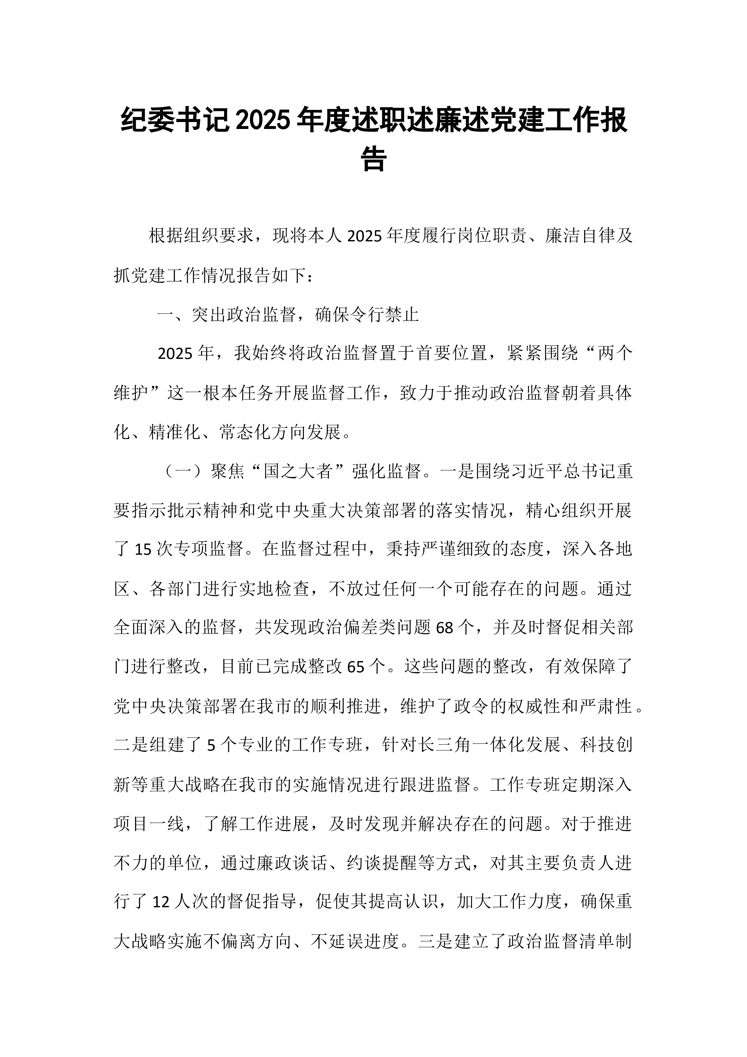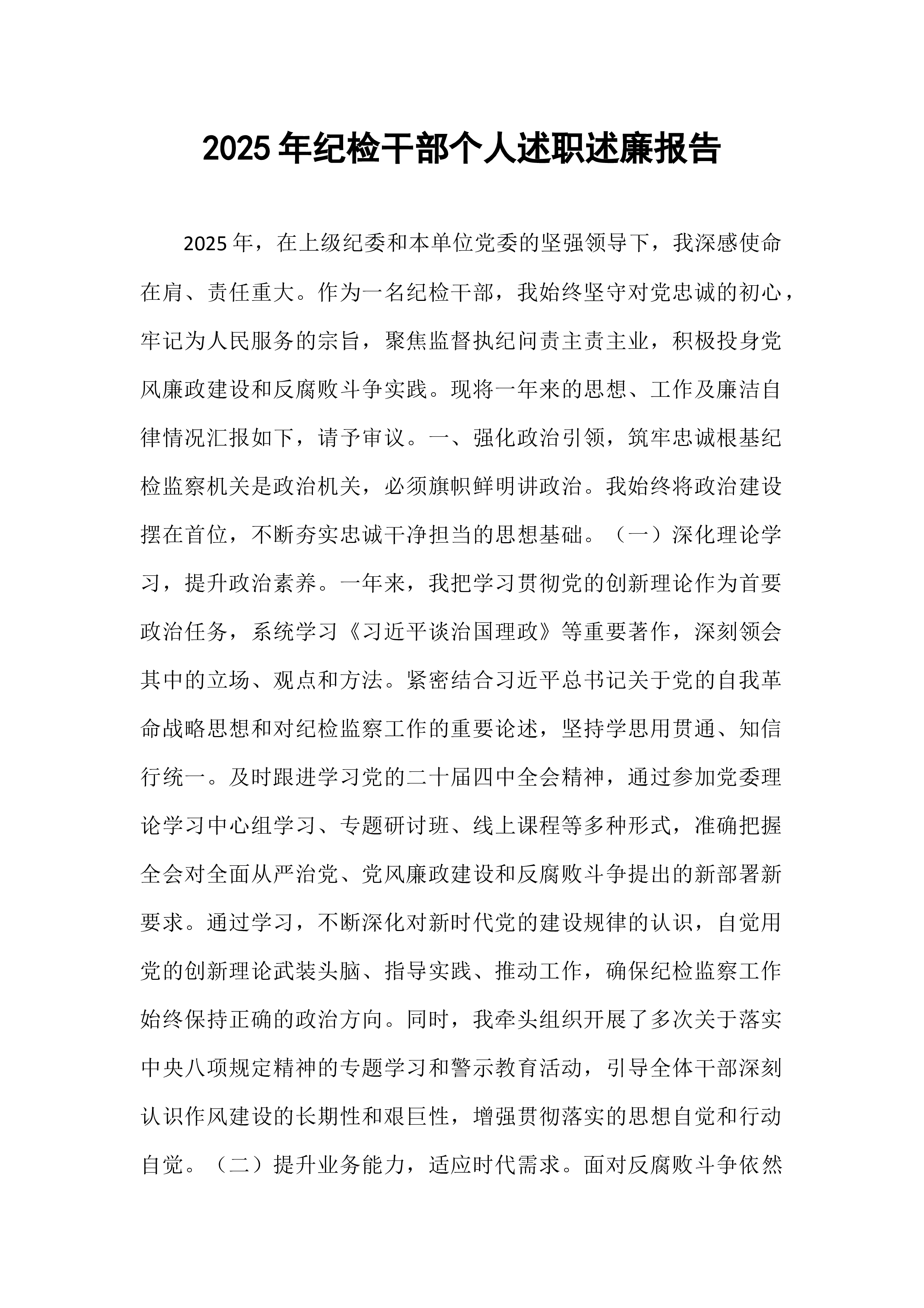 2025年纪检干部个人述职述廉报告2025年,在上级纪委和本单位党委的坚强领导下,我深感使命在肩、责任重大。作为一名纪检干部,我始终坚守对党忠诚的初心,牢记为人民服务的宗旨,聚焦监督执纪问责主责主业,积极投身党风廉政建设和反腐败斗争实践。现将一年来的思想、工作及廉洁自律情况汇报如下,请予审议。一、强化政治引领,筑牢忠诚根基纪检监察机关是政治机关,必须旗帜鲜明讲政治。我始终将政治建设摆在首位,不断夯实忠诚干净担当的思想基础。(一)深化理论学习,提升政治素养。一年来,我把学习贯彻党的创新理论作为首要政治任务,系统学习《习近平谈治国理政》等重要著作,深刻领会其中的立场、观点和方法。紧密结合习近平总书记关于党的自我革命战略思想和对纪检监察工作的重要论述,坚持学思用贯通、知信行统一。及时跟进学习党的二...
