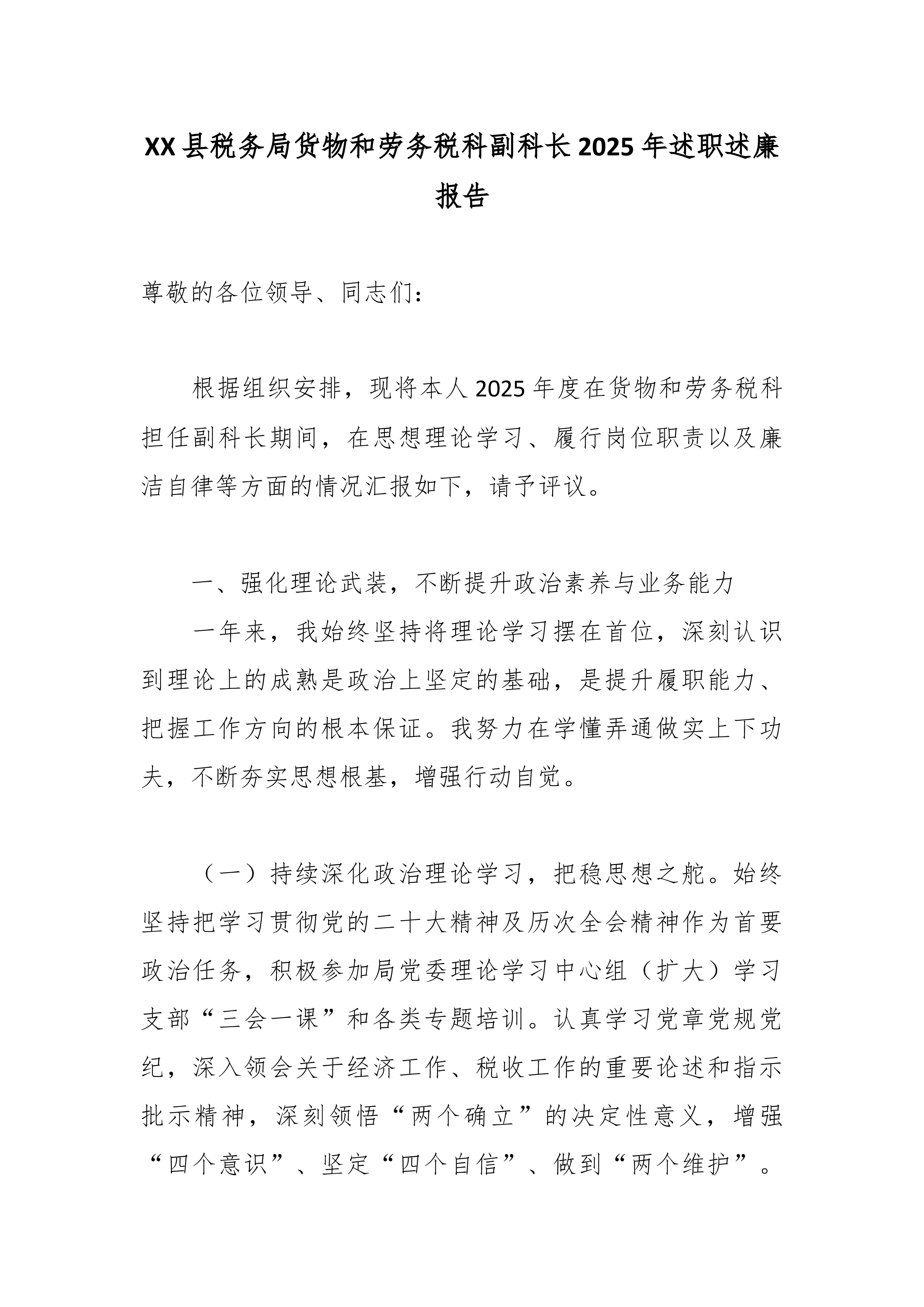 (3篇)县税务局货物和劳务税科副科长2025年述职述廉报告汇编目录 1.XX县税务局货物和劳务税科副科长2025年述职述廉报告2 2.XX县税务局货物和劳务税科副科长2025年述职述廉报告7 3.XX县税务局货物和劳务税科副科长2025年述职述廉报告13XX县税务局货物和劳务税科副科长2025年述职述廉报告 2025年,在县局党委的坚强领导下,在科室全体同事的支持配合下,我始终坚守货物和劳务税管理岗位职责,以政治建设为统领,以履职尽责为核心,以廉洁自律为底线,扎实推进各项税收工作落地见效,圆满完成了年度各项工作任务。现将全年理论学习、履职尽责、廉洁自律等情况报告如下: 一、筑牢思想根基,抓实理论武装,锤炼过硬政治素养 作为税务系统基层业务岗位干部,我始终把理论学习摆在首位,坚持以...