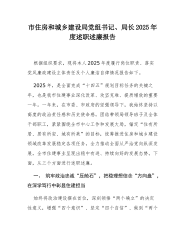 市住房和城乡建设局党组书记、局长2025年度述职述廉报告根据组织要求,现将本人2025年度履行岗位职责、落实党风廉政建设主体责任及个人廉洁自律情况报告如下。2025年,是全面完成“十四五”规划目标任务的关键之年,也是我市住建事业深化改革、攻坚克难、提质增效的重要一年。一年来,在市委、市政府的坚强领导下,我始终坚持以高度的政治责任感和历史使命感,团结带领局领导班子及全体干部职工,紧紧围绕全市中心工作和发展大局,锚定“住有所居、居有所安、城有所美”的目标,统筹推进住房和城乡建设领域改革发展稳定各项任务,全力推动全面从严治党向纵深发展,全市住建事业呈现出稳中有进、持续向好的发展态势。下面,从三个方面进行述职述廉。一、筑牢政治忠诚“压舱石”,把稳理想信念“方向盘”,在深学笃行中彰显住建担当始终将政治...