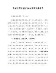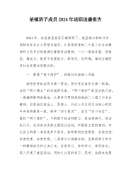 某镇班子成员2024年述职述廉报告2024年,在县委县政府正确领导下,我坚持以新时代中国特色社会主义思想为指导,认真贯彻党的二十届三中全会精神和习总书记视察湖北重要讲话精神,一心一意谋发展、促转型、增实力,驰而不息提能力、转作风、优环境,推动全镇经济社会发展在迈新台阶。一、聚焦“两个维护”,把绝对忠诚铸入灵魂始终把讲政治作为第一要求,把对党忠诚作为第一标准,当好“两个确立”的忠诚捍卫者、“两个维护”的坚决执行者。一是旗帜鲜明讲政治。认真学习贯彻党的党的二十届三中全会精神,自觉地在政治上、思想上、行动上与以同志为核心的党中央保持高度一致,树牢“四个意识”、坚定“四个自信”、做到“两个维护”,不断...