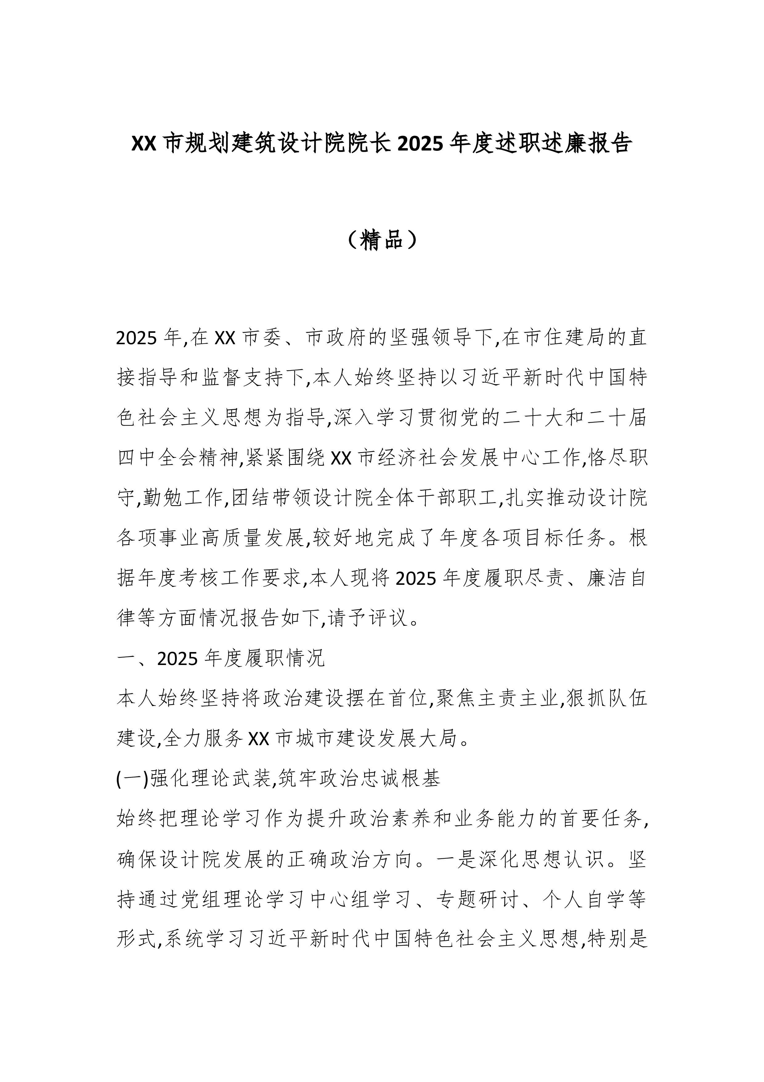 XX市规划建筑设计院院长2025年度述职述廉报告(精品)2025年,在XX市委、市政府的坚强领导下,在市住建局的直接指导和监督支持下,本人始终坚持以习近平新时代中国特色社会主义思想为指导,深入学习贯彻党的二十大和二十届四中全会精神,紧紧围绕XX市经济社会发展中心工作,恪尽职守,勤勉工作,团结带领设计院全体干部职工,扎实推动设计院各项事业高质量发展,较好地完成了年度各项目标任务。根据年度考核工作要求,本人现将2025年度履职尽责、廉洁自律等方面情况报告如下,请予评议。一、2025年度履职情况本人始终坚持将政治建设摆在首位,聚焦主责主业,狠抓队伍建设,全力服务XX市城市建设发展大局。(一)强化理论武装,筑牢政治忠诚根基始终把理论学习作为提升政治素养和业务能力的首要任务,确保设计院发展的正确政治方...
