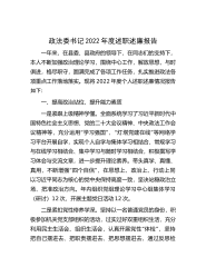 政法委书记述职述廉报告五年来,在区委的正确领导下,在上级业务部门的指导帮助下,我不断加强学习,提升能力,围绕中心,服务大局,认真履行岗位职责,创造性地开展工作,圆满完成了各项工作任务,现将有关情况汇报如下:一、抓实理论学习,提升政治素质一是牢牢把握“讲政治”这个首位要求,不断提升政治素质。把学习习近平新时代中国特色社会主义思想和党的十九大以来的历届全会精神作为首要政治任务,认真学习习近平总书记“七一”重要讲话精神,进一步树立“四个意识”,坚定“四个自信”,做到“两个维护”,与党中央保持高度一致。二是牢把握“强理论”这个行动指南,不断提升理论水平。结合理论中心组学习和党校培训,不断增强学习内生动...