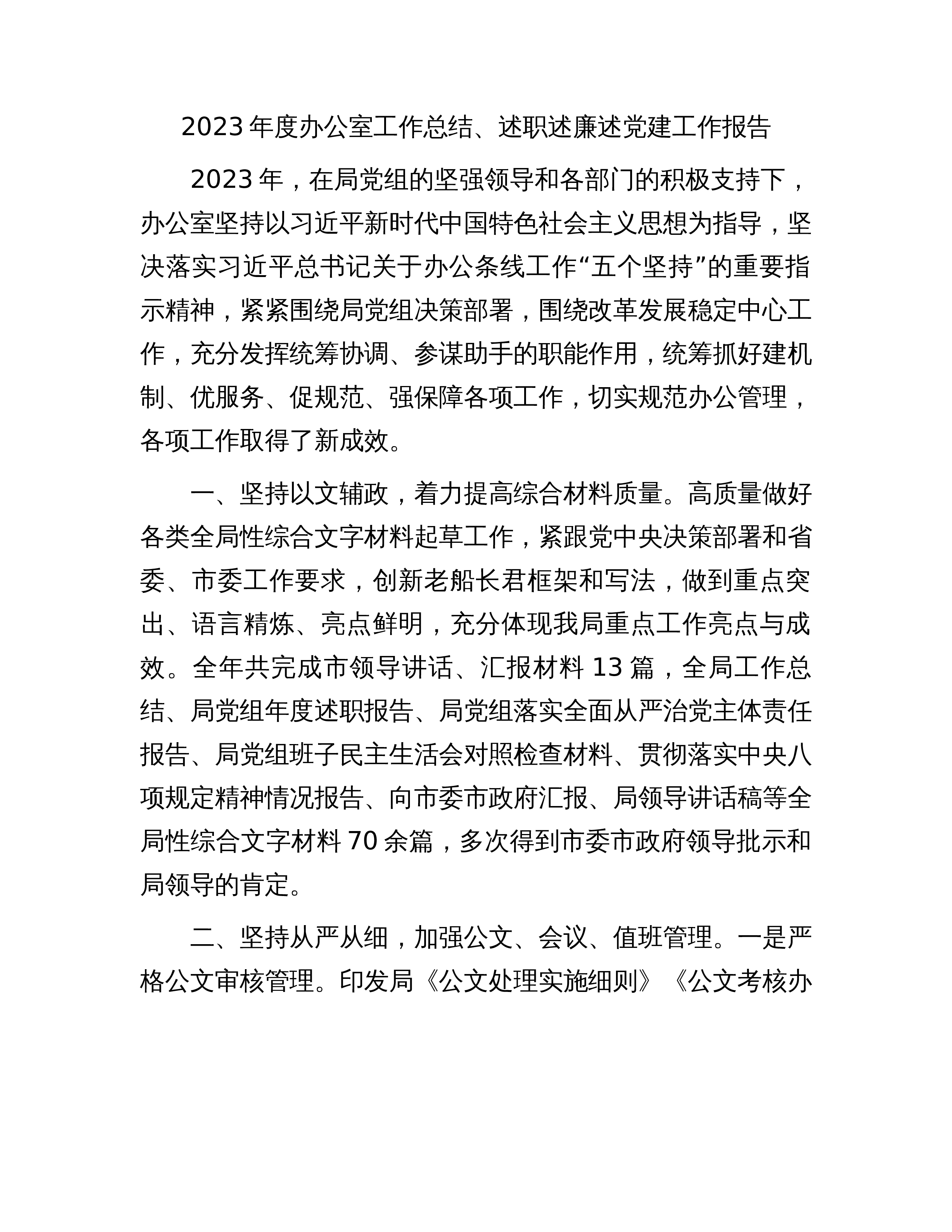 2023年度办公室工作总结、述职述廉述党建工作报告2023年,在局党组的坚强领导和各部门的积极支持下,办公室坚持以习近平新时代中国特色社会主义思想为指导,坚决落实习近平总书记关于办公条线工作“五个坚持”的重要指示精神,紧紧围绕局党组决策部署,围绕改革发展稳定中心工作,充分发挥统筹协调、参谋助手的职能作用,统筹抓好建机制、优服务、促规范、强保障各项工作,切实规范办公管理,各项工作取得了新成效。一、坚持以文辅政,着力提高综合材料质量。高质量做好各类全局性综合文字材料起草工作,紧跟党中央决策部署和省委、市委工作要求,创新文稿框架和写法,做到重点突出、语言精炼、亮点鲜明,充分体现我局重点工作亮点与成效...