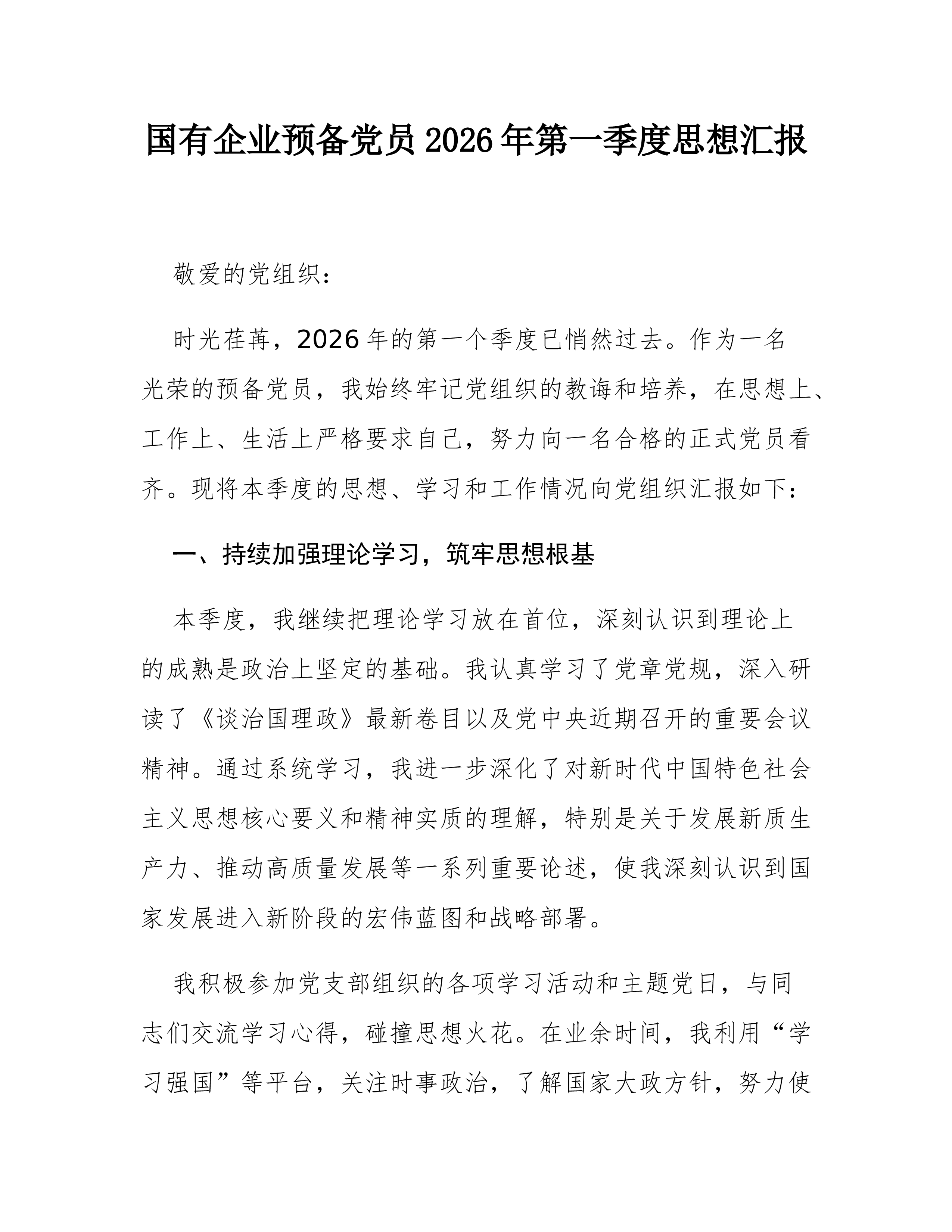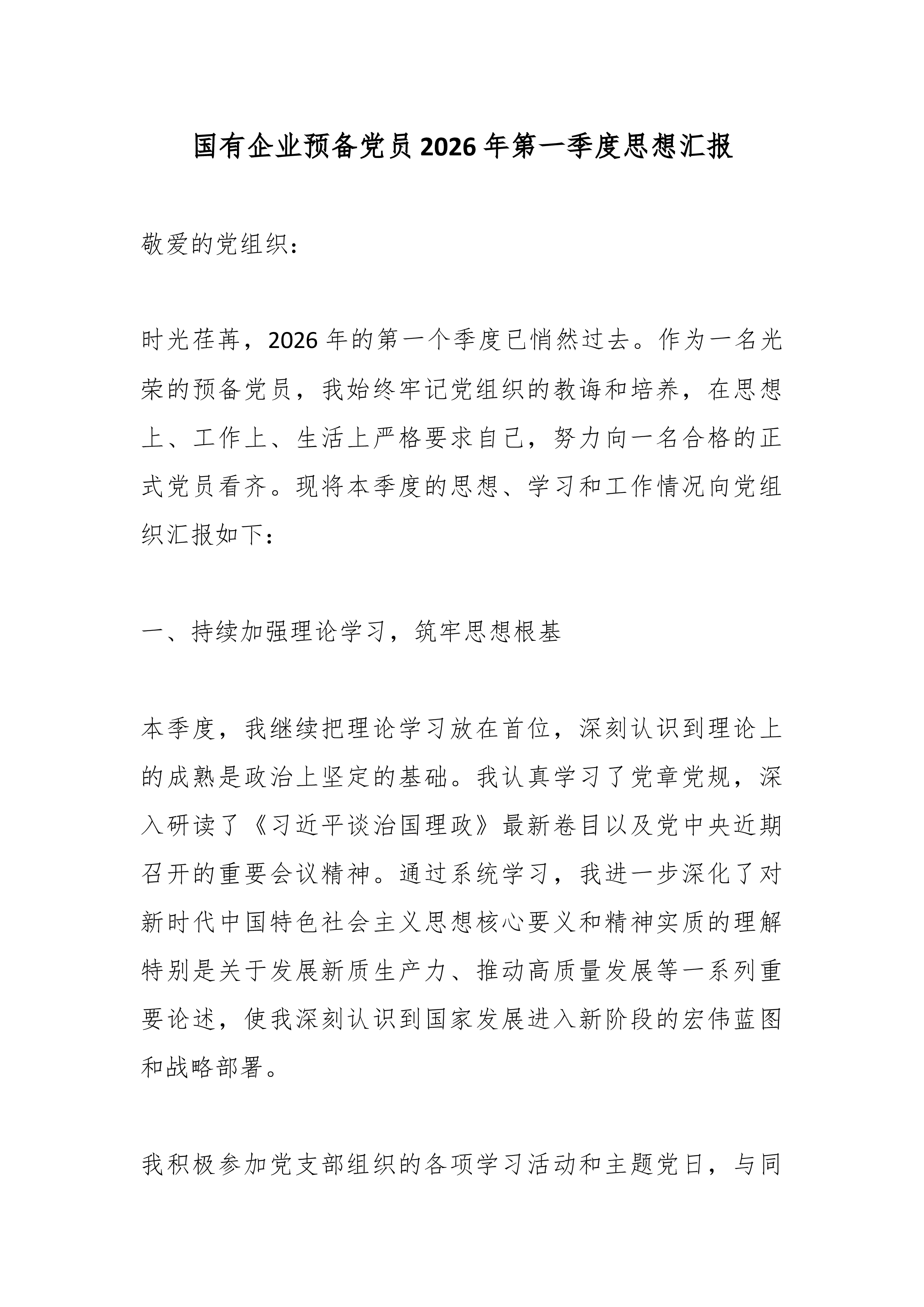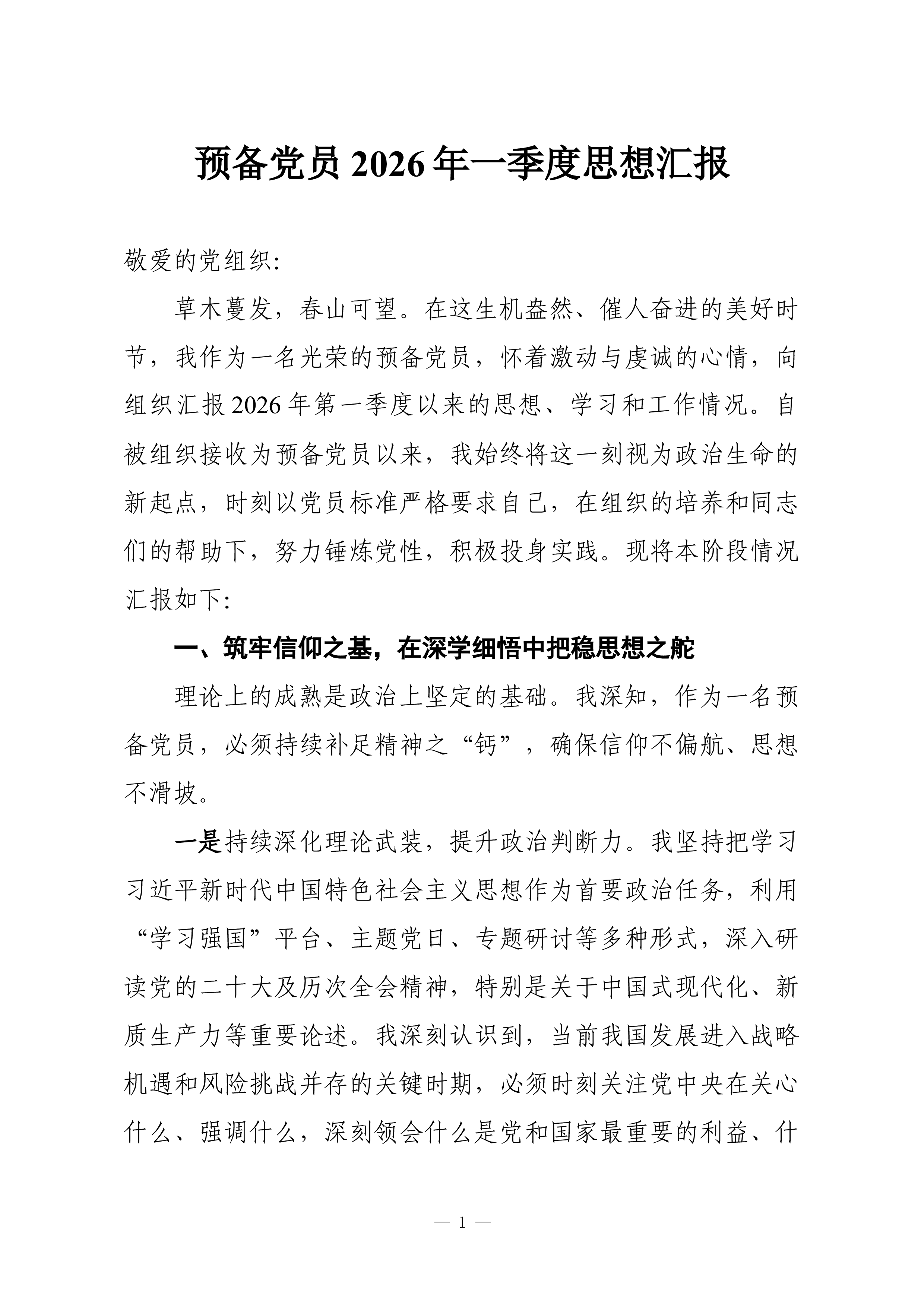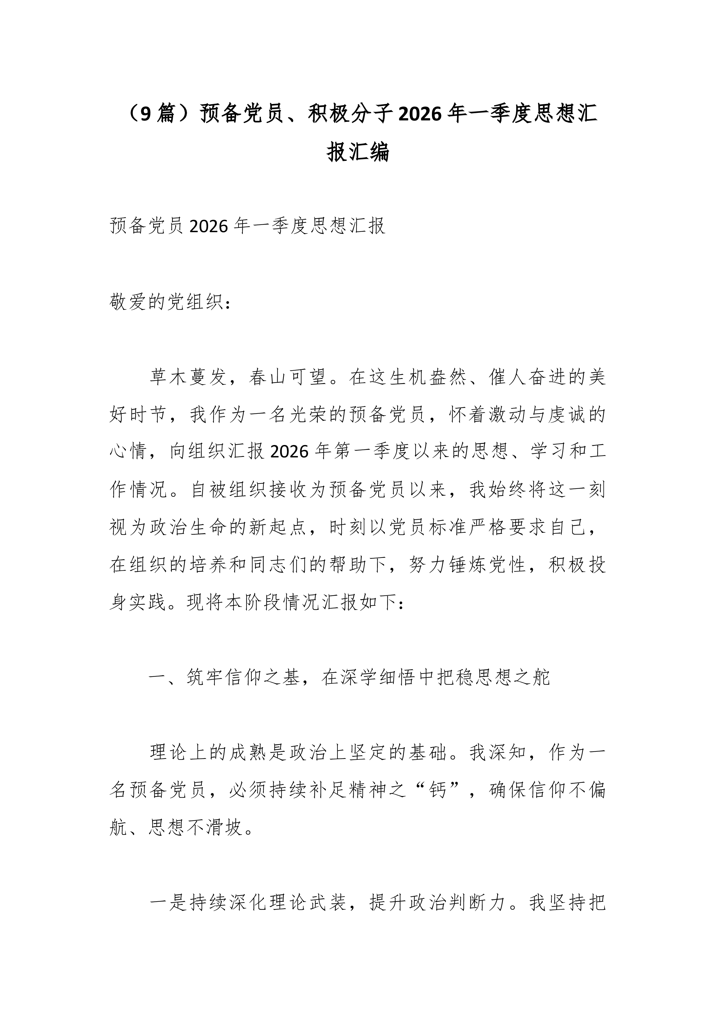(9篇)预备党员、积极分子2026年一季度思想汇报汇编预备党员2026年一季度思想汇报敬爱的党组织: 草木蔓发,春山可望。在这生机盎然、催人奋进的美好时节,我作为一名光荣的预备党员,怀着激动与虔诚的心情,向组织汇报2026年第一季度以来的思想、学习和工作情况。自被组织接收为预备党员以来,我始终将这一刻视为政治生命的新起点,时刻以党员标准严格要求自己,在组织的培养和同志们的帮助下,努力锤炼党性,积极投身实践。现将本阶段情况汇报如下: 一、筑牢信仰之基,在深学细悟中把稳思想之舵 理论上的成熟是政治上坚定的基础。我深知,作为一名预备党员,必须持续补足精神之“钙”,确保信仰不偏航、思想不滑坡。 一是持续深化理论武装,提升政治判断力。我坚持把学习习近平新时代中国特色社会主义思想作为首要政治任务...
