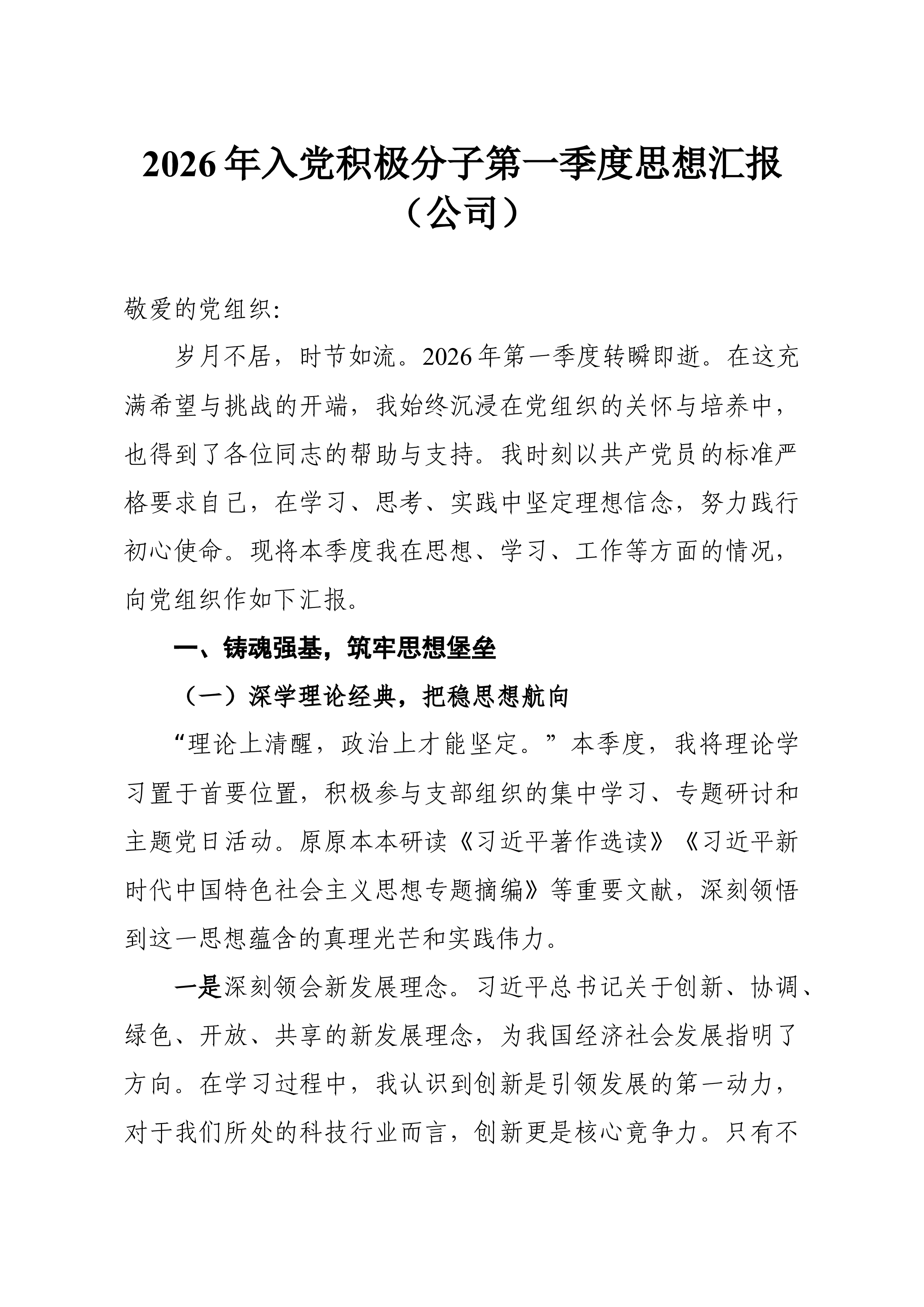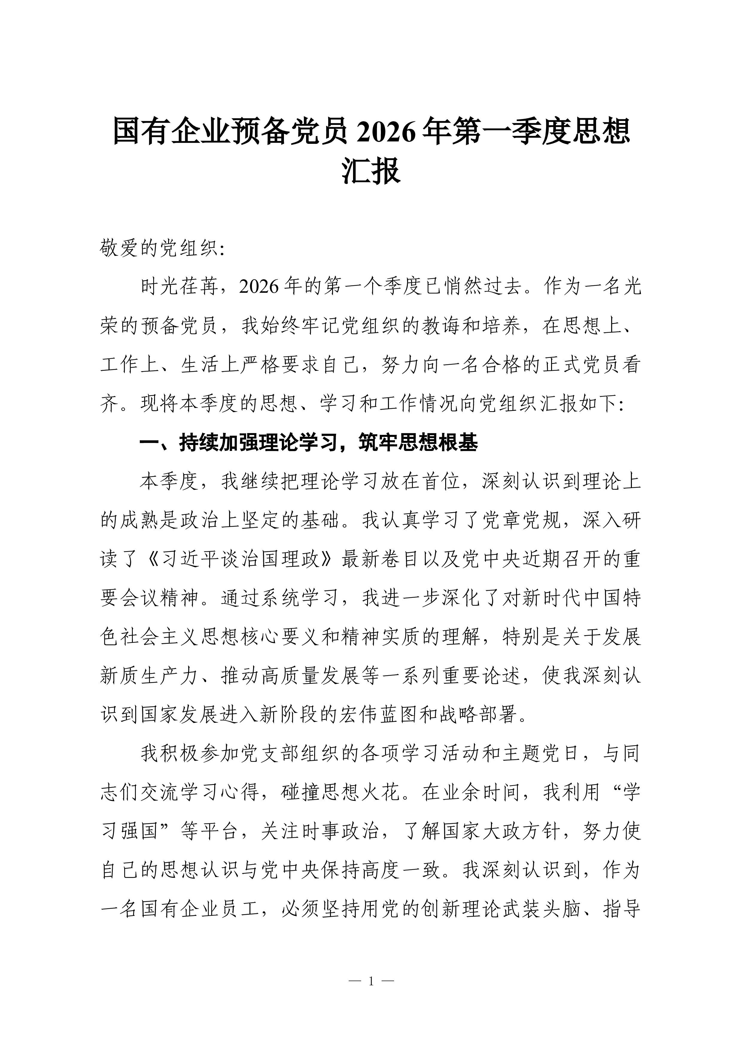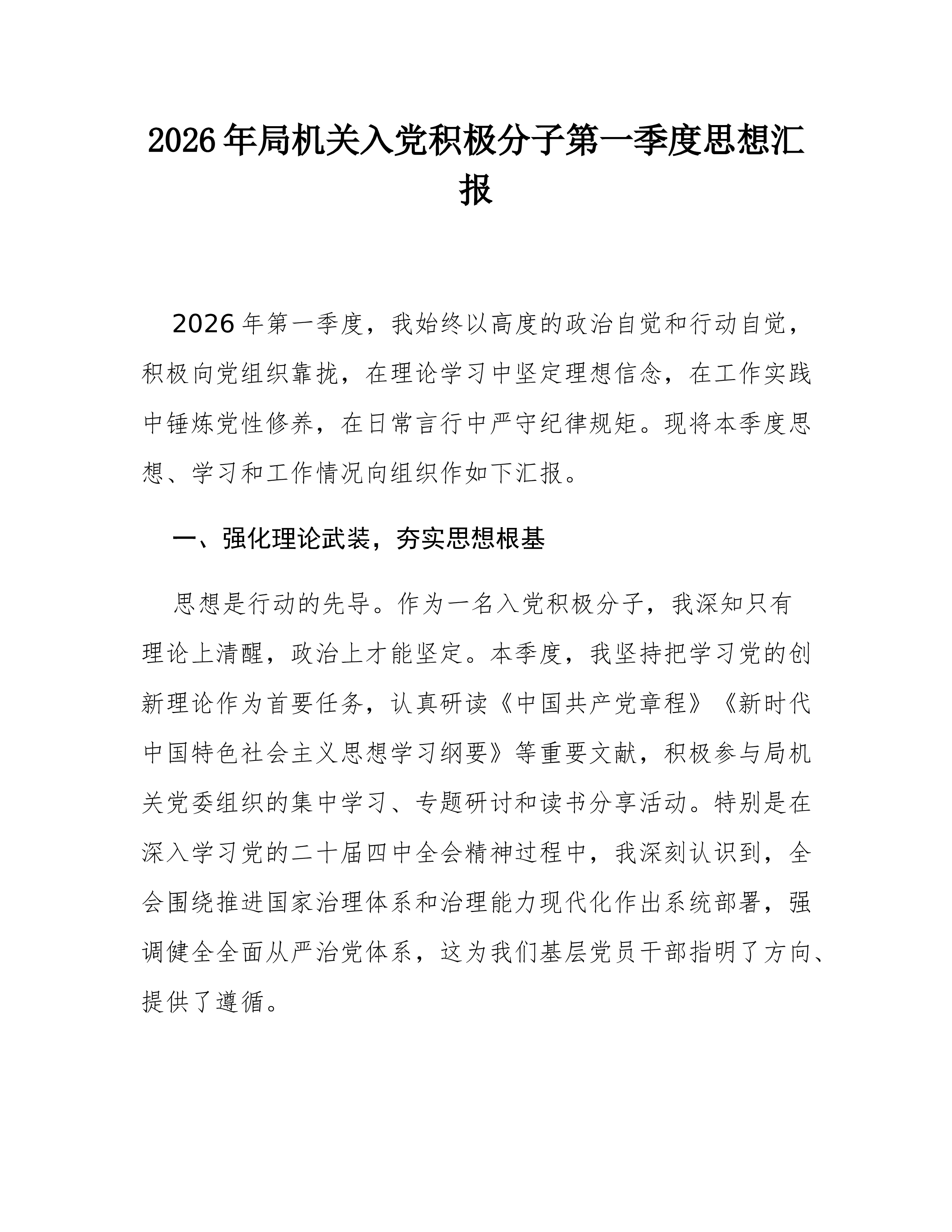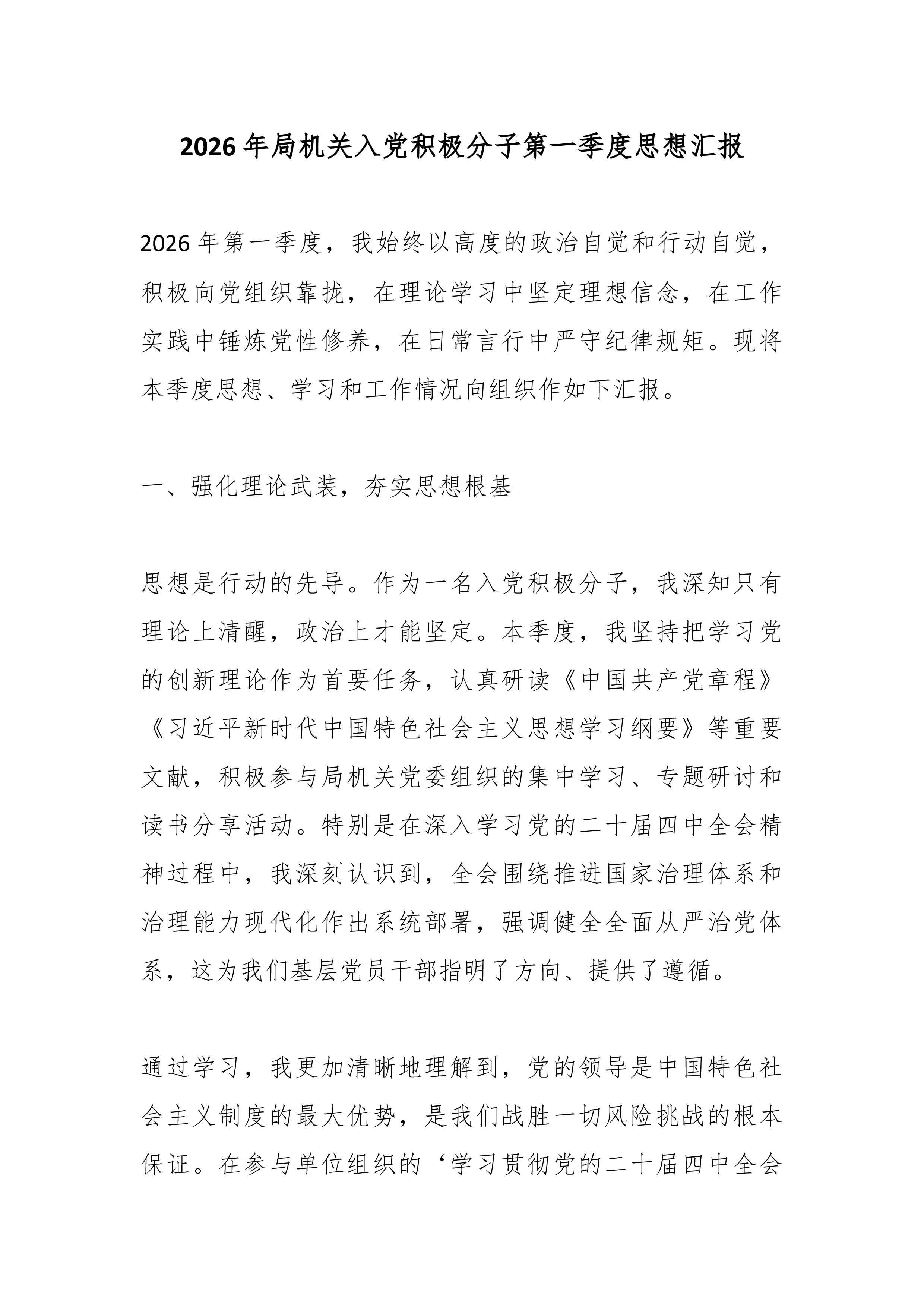 (9篇)预备党员、积极分子2026年一季度思想汇报汇编预备党员2026年一季度思想汇报敬爱的党组织: 草木蔓发,春山可望。在这生机盎然、催人奋进的美好时节,我作为一名光荣的预备党员,怀着激动与虔诚的心情,向组织汇报2026年第一季度以来的思想、学习和工作情况。自被组织接收为预备党员以来,我始终将这一刻视为政治生命的新起点,时刻以党员标准严格要求自己,在组织的培养和同志们的帮助下,努力锤炼党性,积极投身实践。现将本阶段情况汇报如下: 一、筑牢信仰之基,在深学细悟中把稳思想之舵 理论上的成熟是政治上坚定的基础。我深知,作为一名预备党员,必须持续补足精神之“钙”,确保信仰不偏航、思想不滑坡。 一是持续深化理论武装,提升政治判断力。我坚持把学习习近平新时代中国特色社会主义思想作为首要政治任务...