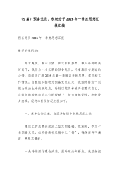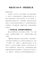 (9篇)预备党员、积极分子2026年一季度思想汇报汇编预备党员2026年一季度思想汇报敬爱的党组织: 草木蔓发,春山可望。在这生机盎然、催人奋进的美好时节,我作为一名光荣的预备党员,怀着激动与虔诚的心情,向组织汇报2026年第一季度以来的思想、学习和工作情况。自被组织接收为预备党员以来,我始终将这一刻视为政治生命的新起点,时刻以党员标准严格要求自己,在组织的培养和同志们的帮助下,努力锤炼党性,积极投身实践。现将本阶段情况汇报如下: 一、筑牢信仰之基,在深学细悟中把稳思想之舵 理论上的成熟是政治上坚定的基础。我深知,作为一名预备党员,必须持续补足精神之“钙”,确保信仰不偏航、思想不滑坡。 一是持续深化理论武装,提升政治判断力。我坚持把学习习近平新时代中国特色社会主义思想作为首要政治任务...