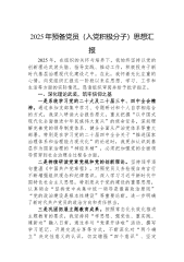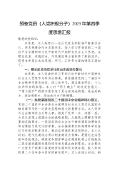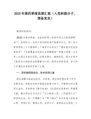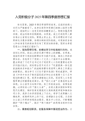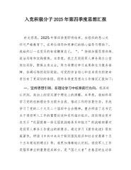 某局预备党员(入党积极分子)2025年第四季度思想汇报2025年第四季度,本人始终坚持以新时代中国特色社会主义思想为指导,深入学习贯彻党的二十大和二十届历次全会精神,牢牢把握新时代党的建设总要求,在组织的培养教育和领导同事的帮助支持下,不断锤炼党性修养、提升政治能力、强化宗旨意识,努力将思想进步转化为服务民生的实际行动。在这一季度的工作与学习中,我深切感受到理论武装的强大力量、群众工作的深厚温度和岗位职责的时代分量,进一步坚定了听党话、跟党走的政治自觉,增强了立足人社岗位建功新时代的责任感与使命感。一是深化理论武装,筑牢信仰之基。思想是行动的先导,理论是实践的指南。作为一名青年党员干部,我始终坚持把加强政治理论学习作为首要任务,积极参加党支部组织的集中学习、专题研讨和主题党日活动,系统研读《...