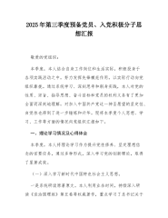 2025年第三季度预备党员(入党积极分子)思想汇报(通用稿)时序更替,光阴流转。2025年第三季度已经圆满落下帷幕。今年是“十五五”开局的关键一年,也是全面建设社会主义现代化国家的重要时段。回顾这三个月,党和国家大事要事交织推进:中央经济工作会议明确了“高质量发展是硬道理”的主基调,绿色低碳理念不断转化为生动实践,科技自立自强的脚步愈加坚定,民生改善举措持续落地见效。这些鲜活的现实场景不仅昭示着国家前行的方向,也不断激励我作为一名预备党员(或入党积极分子),更加自觉地校准思想坐标、锤炼政治品格、厚植为民情怀。基于此,我将本季度思想、学习和实践情况汇报如下。一、以“思想淬炼”为根本,在常学常新中坚定理想信念理论学习是党员安身立命的“根”和“魂”。这一季度,我始终坚持把加强理论武装作为首要任务,...