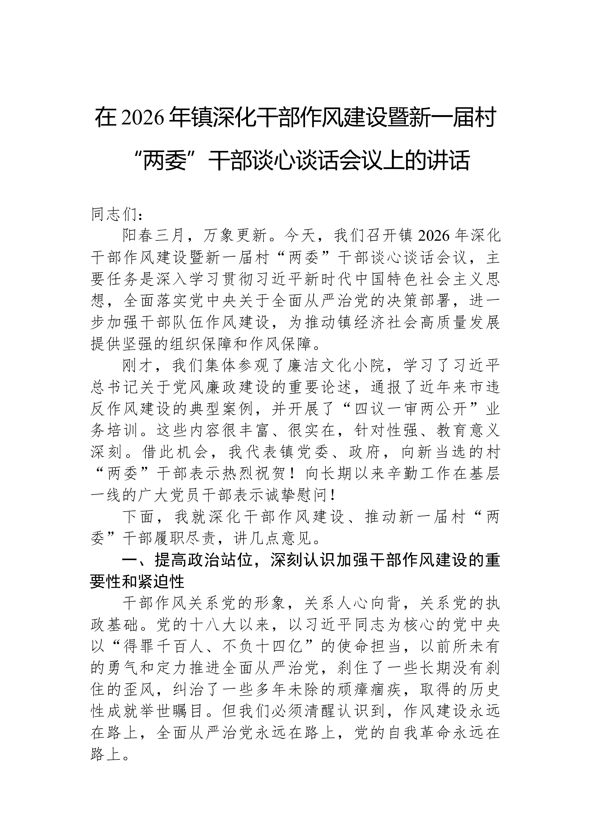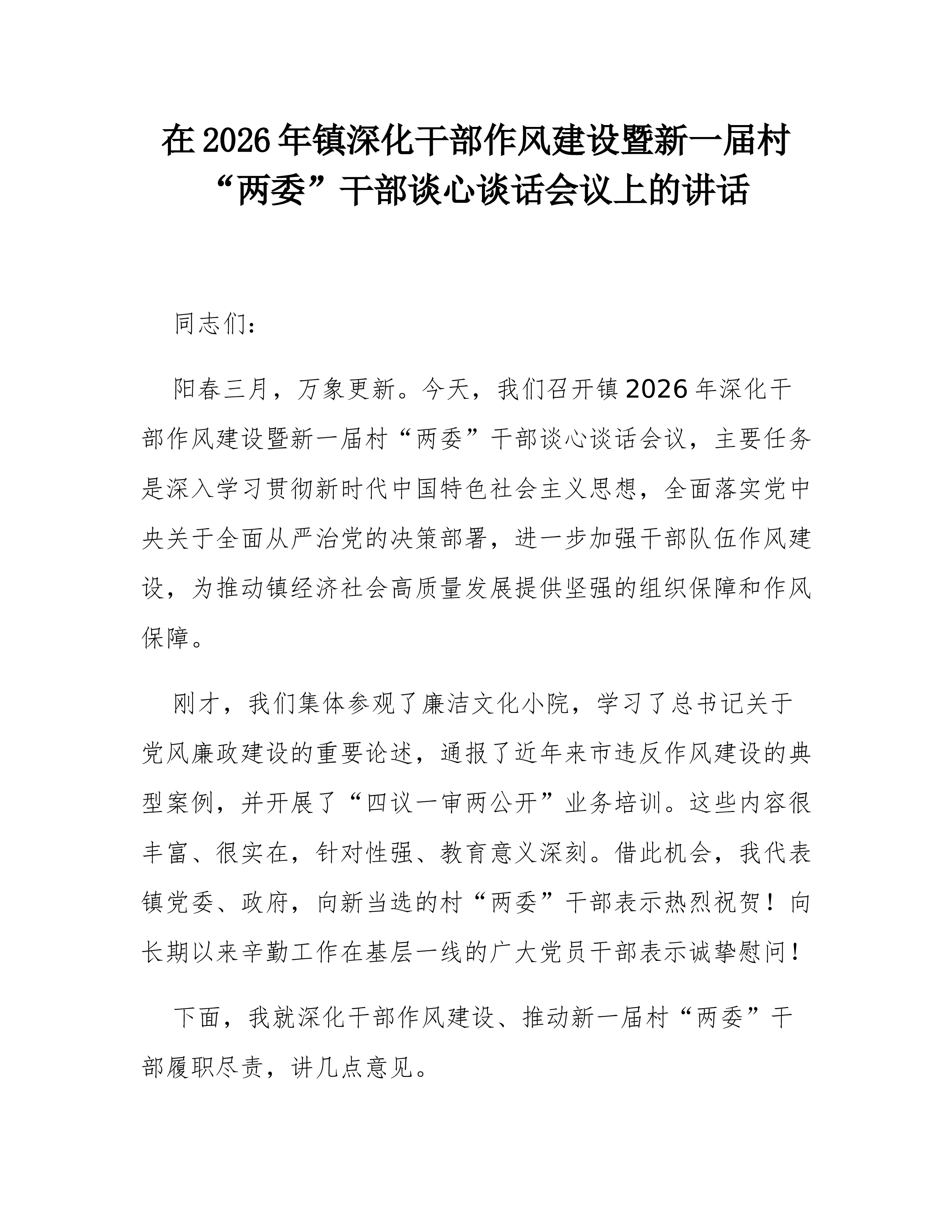 在2026年镇深化干部作风建设暨新一届村“两委”干部谈心谈话会议上的讲话同志们:阳春三月,万象更新。今天,我们召开镇2026年深化干部作风建设暨新一届村“两委”干部谈心谈话会议,主要任务是深入学习贯彻习近平新时代中国特色社会主义思想,全面落实党中央关于全面从严治党的决策部署,进一步加强干部队伍作风建设,为推动镇经济社会高质量发展提供坚强的组织保障和作风保障。刚才,我们集体参观了廉洁文化小院,学习了习近平总书记关于党风廉政建设的重要论述,通报了近年来市违反作风建设的典型案例,并开展了“四议一审两公开”业务培训。这些内容很丰富、很实在,针对性强、教育意义深刻。借此机会,我代表镇党委、政府,向新当选的村“两委”干部表示热烈祝贺!向长期以来辛勤工作在基层一线的广大党员干部表示诚挚慰问!下面,我就深化...