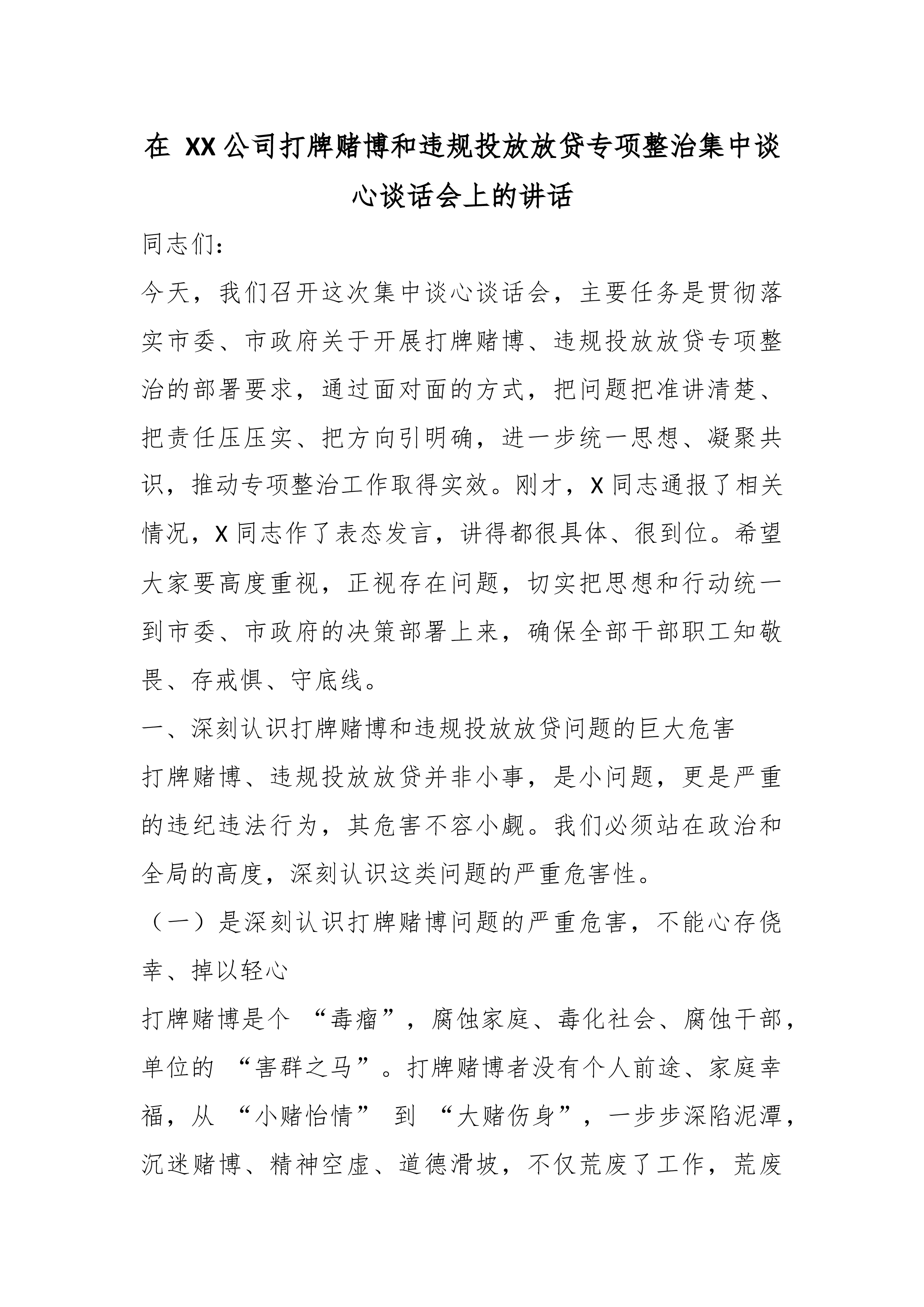 在XX公司打牌赌博和违规投放放贷专项整治集中谈心谈话会上的讲话同志们:今天,我们召开这次集中谈心谈话会,主要任务是贯彻落实市委、市政府关于开展打牌赌博、违规投放放贷专项整治的部署要求,通过面对面的方式,把问题把准讲清楚、把责任压压实、把方向引明确,进一步统一思想、凝聚共识,推动专项整治工作取得实效。刚才,X同志通报了相关情况,X同志作了表态发言,讲得都很具体、很到位。希望大家要高度重视,正视存在问题,切实把思想和行动统一到市委、市政府的决策部署上来,确保全部干部职工知敬畏、存戒惧、守底线。一、深刻认识打牌赌博和违规投放放贷问题的巨大危害打牌赌博、违规投放放贷并非小事,是小问题,更是严重的违纪违法行为,其危害不容小觑。我们必须站在政治和全局的高度,深刻认识这类问题的严重危害性。(一)是深刻认识...