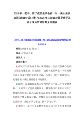 2025年一把手、领导班子成员民主生活会前一对一谈心谈话详细对话记录材料2份与2025年对照“四个带头”个人对照检查材料之今后努力方向、具体整改措施12条2025年民主生活会一对一谈心谈话记录时间:2024年12月21日地点:厅长办公室谈话人:A谈话对象:BA:党员谈心活动开好民主生活会的重要一环,我们必须从思想上重视。今天我以一名普通党员的身份和你一起交流思想、聊聊天,请不要拘束,工作、学习、生活各方面都可以谈。B:好的。通过近期对党的二十届三中全会精神和党的创新理论的学习,我深刻认识到了“两个确立”的决定性意义,提高了政治站位,增强了“四个意识”,自觉在思想上、政治上、行动上同党中央保持高...