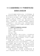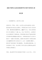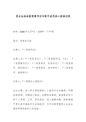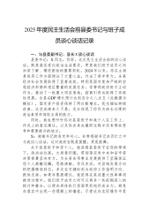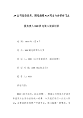 XX公司党委委员、副总经理XXX同志与分管部门主要负责人XXX同志谈心谈话记录 时间:2025年1月X日 地点:XXX副总经理办公室 谈话人:XXX(公司党委委员、副总经理) 谈话对象:XXX(XX部主任) 记录人:XXX 谈话内容: XXX(班子成员,副总经理):根据公司党委关于召开年度民主生活会前的统一部署,今天我们进行一次谈心谈话。主要目的是按照“开诚布公、推心置腹”的要求,在会前和你深入交流思想,沟通情况,既谈谈过去一年的工作和体会,也相互提提醒、找找不足,特别是针对一些苗头性、倾向性问题交换看法,为下一步开展好批评和自我批评做好准备。你先谈谈吧,可以结合你主持XX部工作的实际情况,谈谈你的想法。 XXX(科室负责人):好的,X总。感谢领导安排这次谈心。过去一年,在公...