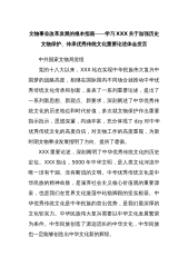 文物事业改革发展的根本指南——学习XXX关于加强历史文物保护、传承优秀传统文化重要论述体会发言中共国家文物局党组党的十八大以来,XXX站在实现中华民族伟大复兴中国梦的战略高度,相继在国际国内不同场合就推动中华优秀传统文化传承和创新,发表了一系列重要论述,提出了一系列新思想、新观点、新要求,深刻阐述了中华优秀传统文化的历史地位和时代价值,多次就文物保护作出重要指示批示,思想深邃,内涵丰富,充分体现了dzy对中华优秀传统文化的高度自信,对文物工作的高度重视,为新时期文物事业发展指明了方向、提供了遵循。XXX重要论述,深刻阐明了中华优秀传统文化的历史定位。XXX指出,5000年中华文明,是人类文化河...
