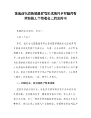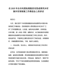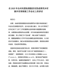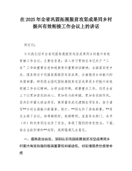 在2025年全市巩固拓展脱贫攻坚成果同乡村振兴有效衔接工作推进会上的讲话同志们:今天,我们召开**市巩固拓展脱贫攻坚成果同乡村振兴有“效衔接工作推进会,目的就是深入贯彻落实总书记关于三”农工作的重要论述,以及国、省有关会议精神,总结经验、分析问题,进一步统一思想、凝聚共识,全力推动我市巩固拓展脱贫攻坚成果同乡村振兴有效衔接工作再上新台阶。刚才,相关县市区、市直单位主要负责同志作了表态发言,讲得都很好,关键是要抓好落实。下面,我讲几点意见。一、肯定成绩,坚定信心,增强做好有效衔接工作的责任感紧迫感近年来,全市各级各部门坚决贯彻落实党中央、国务院和省委、省政府决策部署,把巩固拓展脱贫攻坚成果同乡村振兴有效衔接作为重大政治任务,尽锐出战、真抓实干,取得了阶段性成效,守住了不发生规模性返贫致贫的底线...