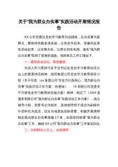 关于“我为群众办实事”实践活动开展情况报告XX公司党委以党史学习教育为连接线,以办实事为落脚点,聚焦特色载体强实效,让党史学起来、党徽亮起来党员动起来,让实事办实,让群众切实有感。做实“我为群众办实事”取得了显著的成效。现将有关工作汇报如下。一、提高政治站位,高度重视为深入学习贯彻习近平总书记在党史学习教育动员大会上的重要讲话精神,按照集团公司党史学习教育领导小组《关于印发〈xx集团公司“学史力行践初心、我为群众办实事”实践活动工作方案〉的通知》、《X有限公司党委关于开展党史学习教育的实施方案》精神,制定了《XXX直属库有限公司“我为群众办实事”实践活动工作方案》,成立领导小组,党委书记为组长...