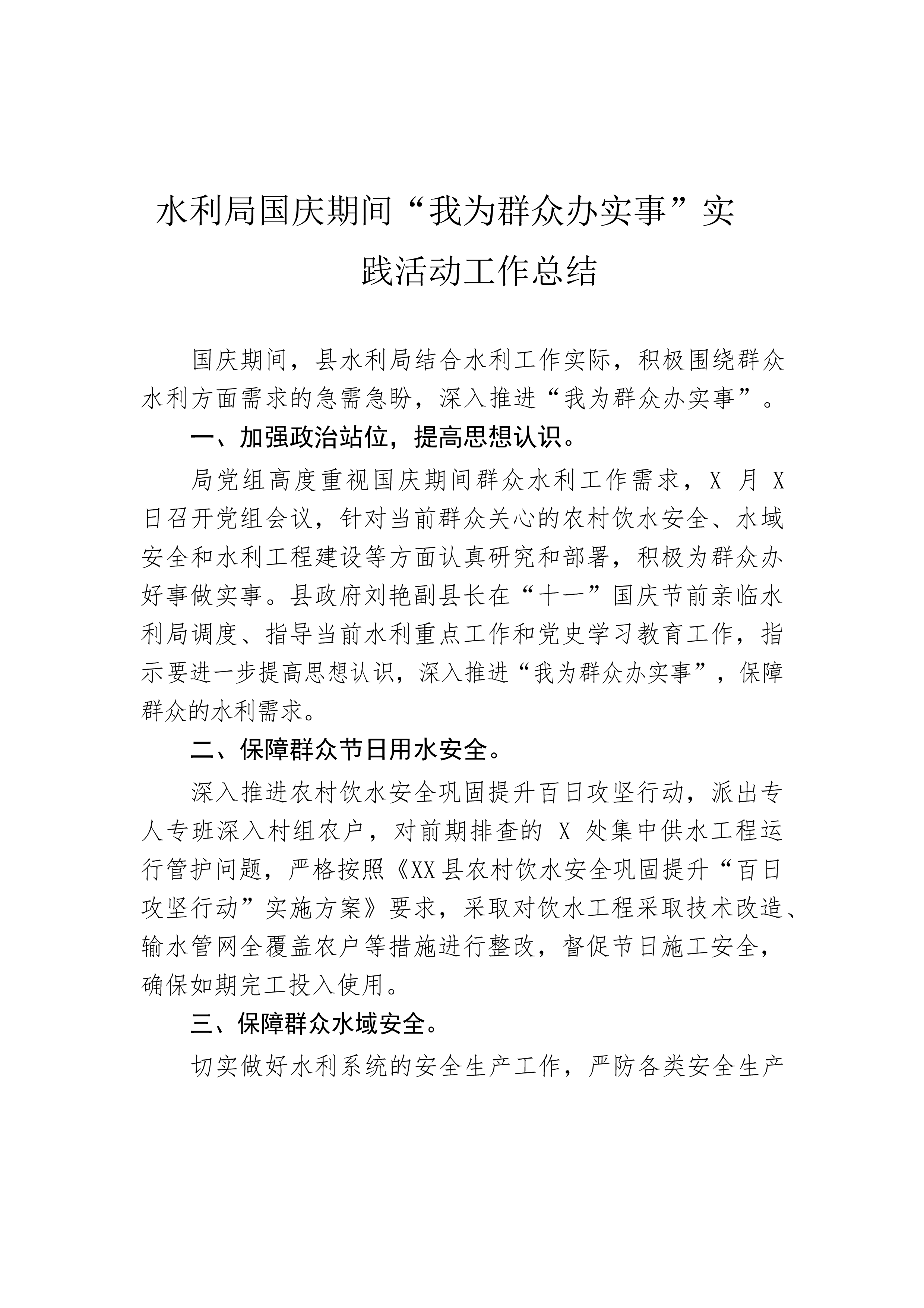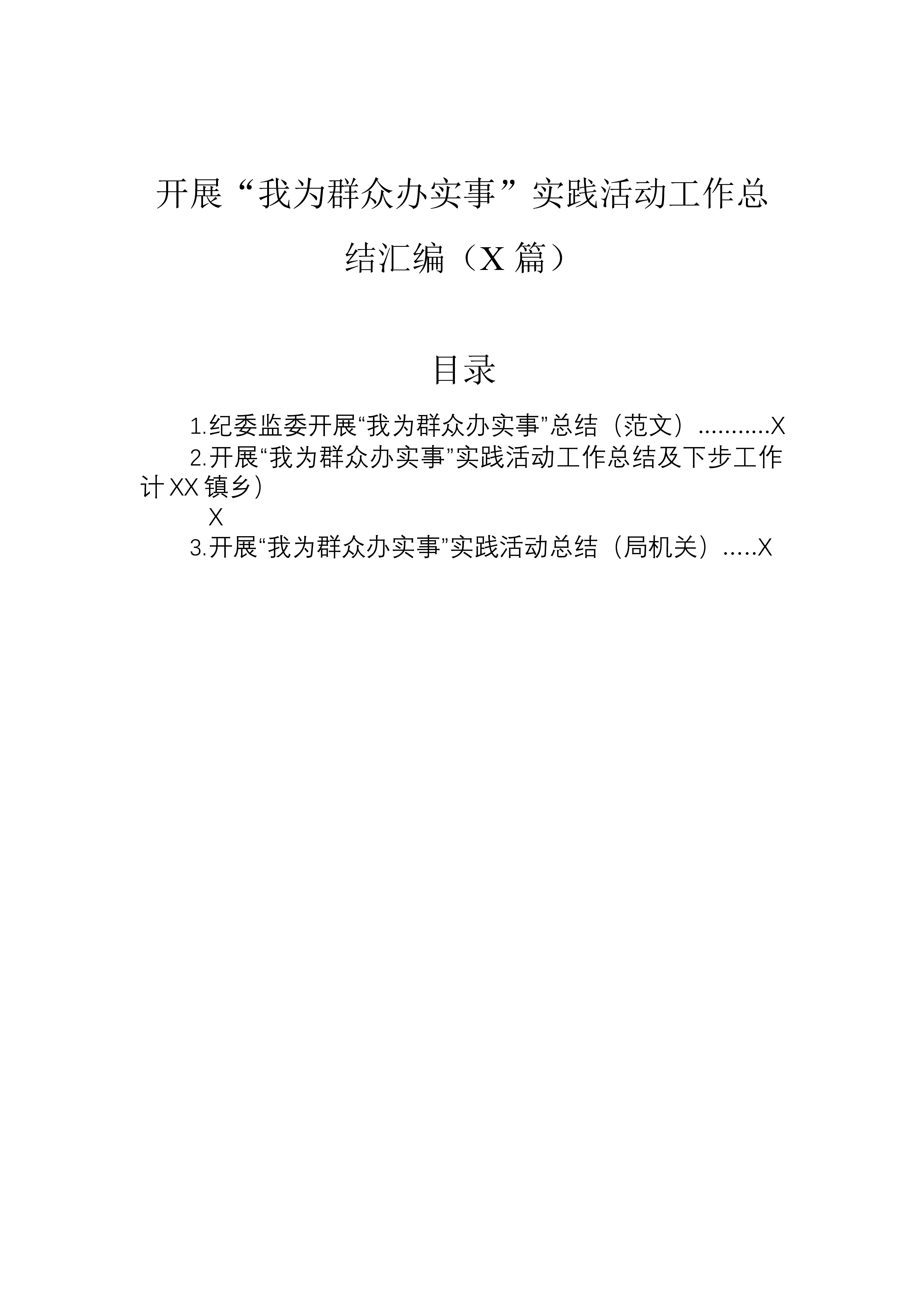 开展“我为群众办实事”实践活动工作总结汇编(X篇)目录1.纪委监委开展“我为群众办实事”总结(范文)...........X2.开展“我为群众办实事”实践活动工作总结及下步工作计XX镇乡)X3.开展“我为群众办实事”实践活动总结(局机关).....X纪委监委开展“我为群众办实事”总结(范文)落实帮扶责任,是省纪委监委确定的x件“我为群众办实事”之一。为此,省纪委监委于2021年选派xx名干部赴XX县开展驻村帮扶,从加强帮扶队伍到建强基层党组织,从推进强村富民到帮办实事好事,持续跟踪巩固脱贫攻坚成果情况,确保不出现规模性返贫,高质量完成了年度各项帮扶任务。帮扶工作是省纪委监委开展“我为群众办实事...