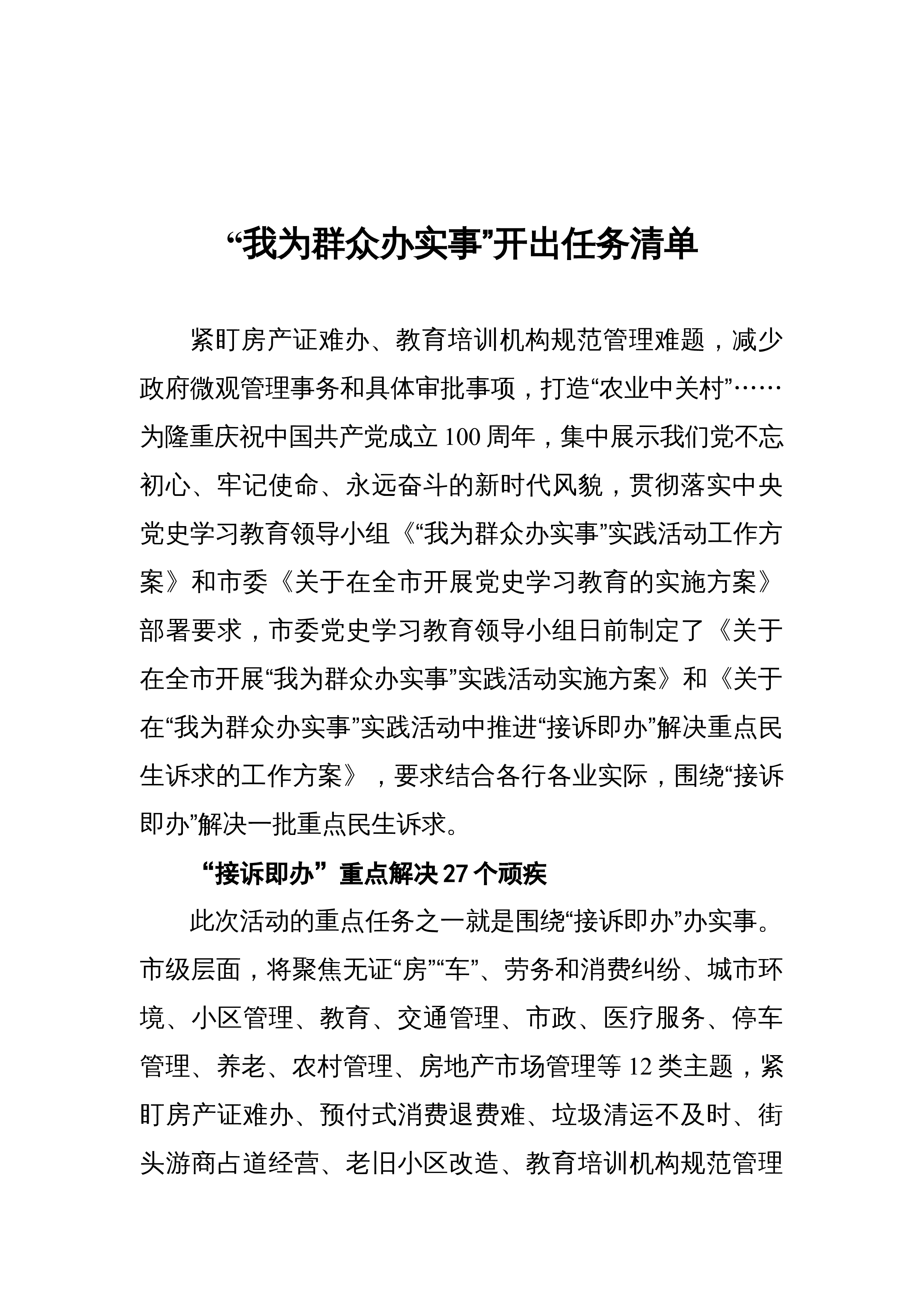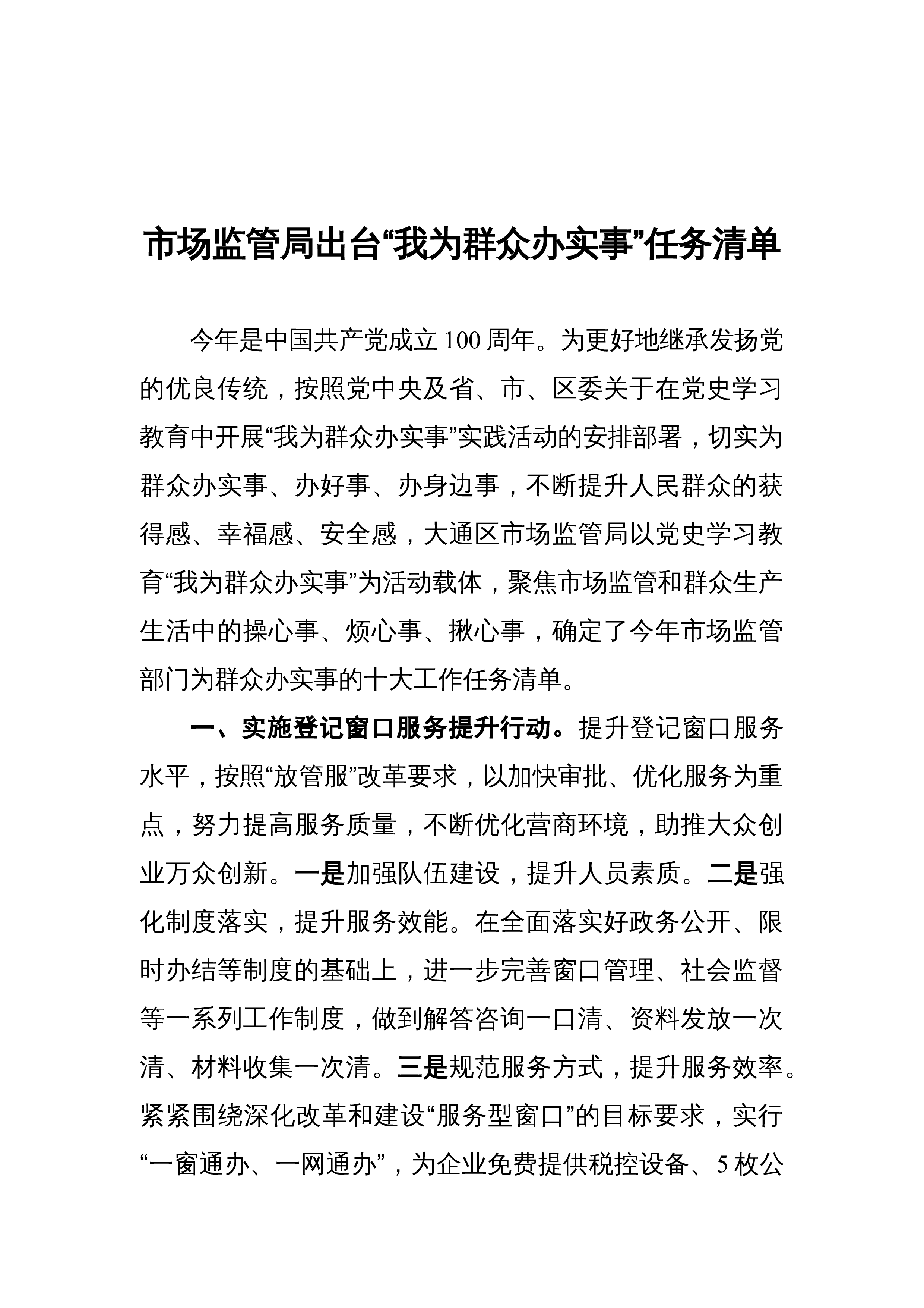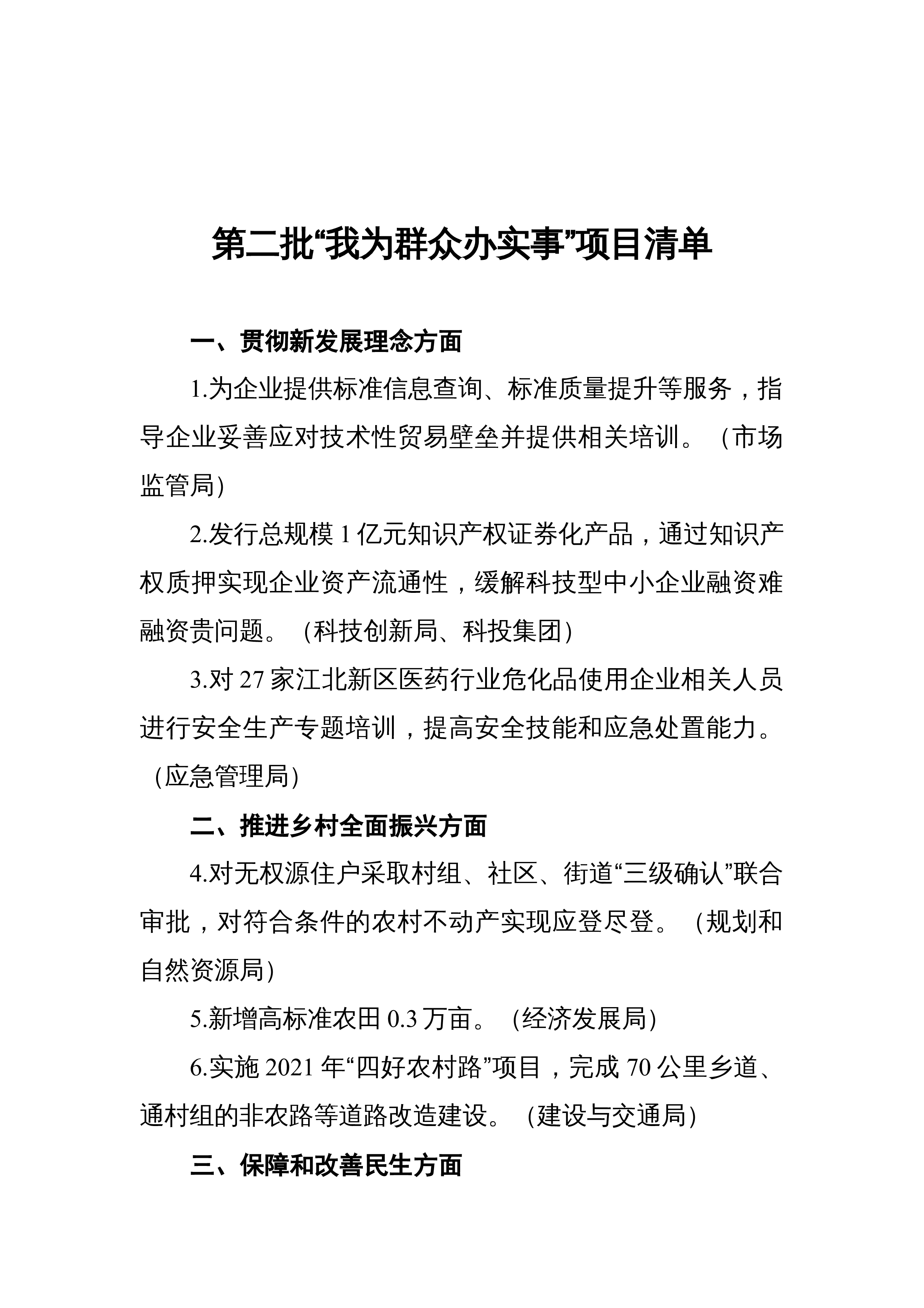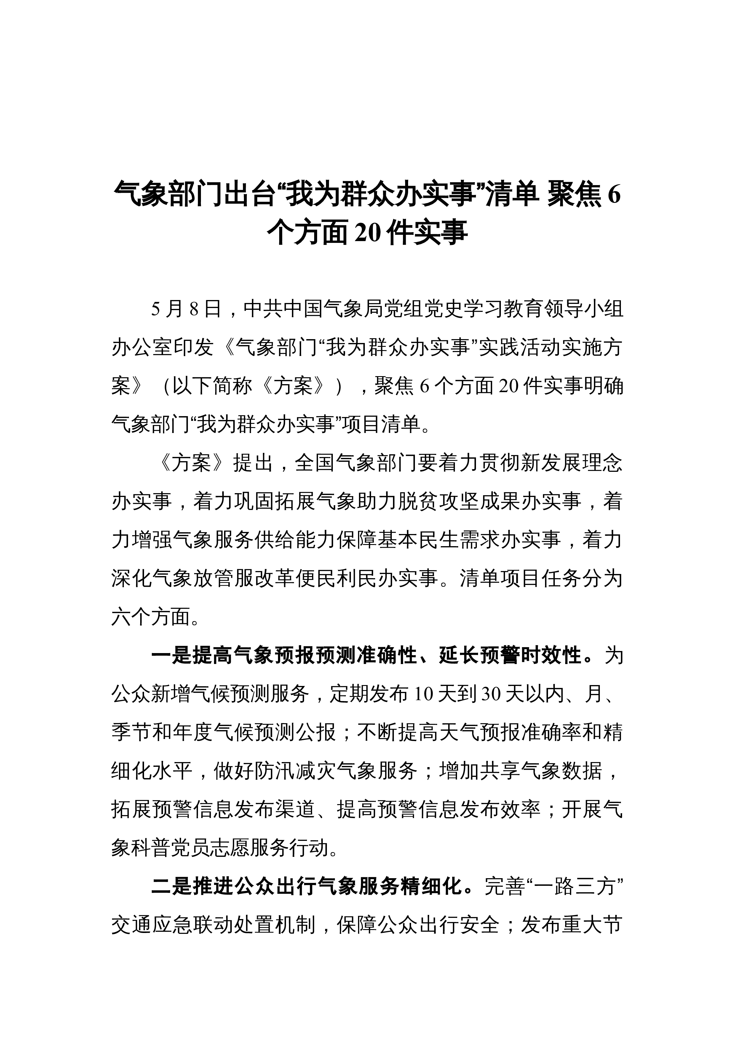 气象部门出台“我为群众办实事”清单聚焦6个方面20件实事5月8日,中共中国气象局党组党史学习教育领导小组办公室印发《气象部门“我为群众办实事”实践活动实施方案》(以下简称《方案》),聚焦6个方面20件实事明确气象部门“我为群众办实事”项目清单。《方案》提出,全国气象部门要着力贯彻新发展理念办实事,着力巩固拓展气象助力脱贫攻坚成果办实事,着力增强气象服务供给能力保障基本民生需求办实事,着力深化气象放管服改革便民利民办实事。清单项目任务分为六个方面。一是提高气象预报预测准确性、延长预警时效性。为公众新增气候预测服务,定期发布10天到30天以内、月、季节和年度气候预测公报;不断提高天气预报准确率和精...