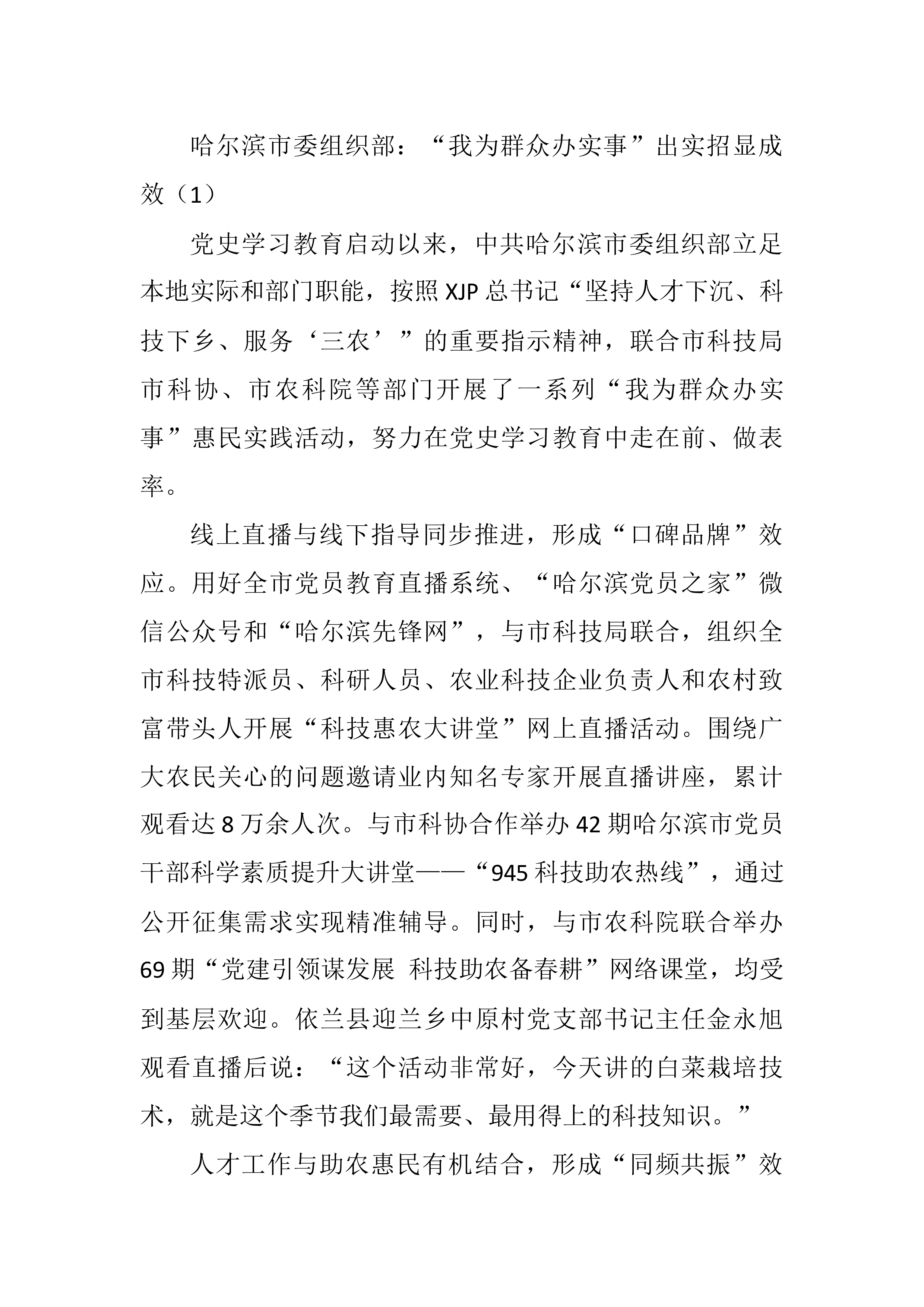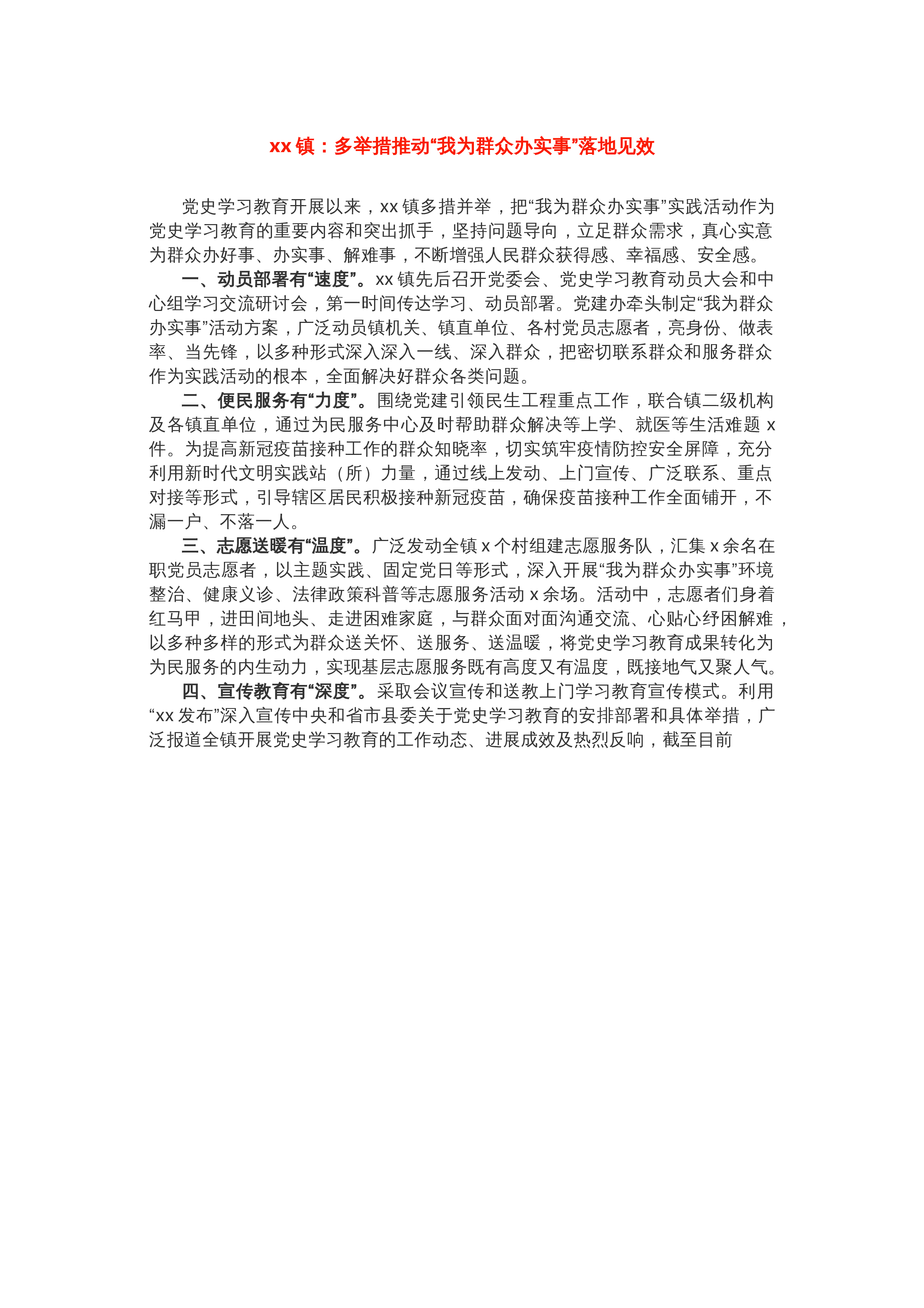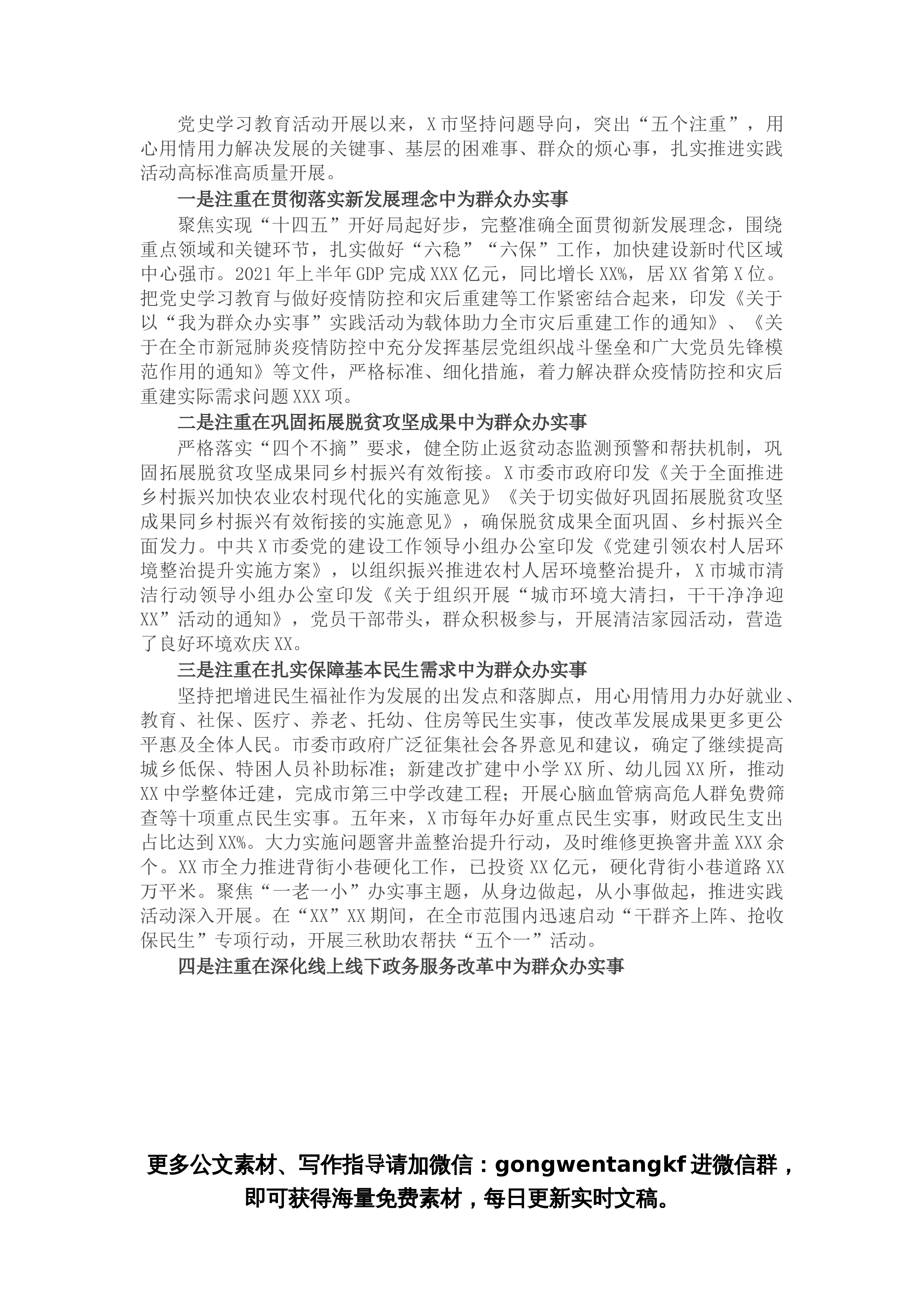 党史学习教育活动开展以来,X市坚持问题导向,突出“五个注重”,用心用情用力解决发展的关键事、基层的困难事、群众的烦心事,扎实推进实践活动高标准高质量开展。一是注重在贯彻落实新发展理念中为群众办实事聚焦实现“十四五”开好局起好步,完整准确全面贯彻新发展理念,围绕重点领域和关键环节,扎实做好“六稳”“六保”工作,加快建设新时代区域中心强市。2021年上半年GDP完成XXX亿元,同比增长XX%,居XX省第X位。把党史学习教育与做好疫情防控和灾后重建等工作紧密结合起来,印发《关于以“我为群众办实事”实践活动为载体助力全市灾后重建工作的通知》、《关于在全市新冠肺炎疫情防控中充分发挥基层党组织战斗堡垒和广...