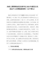 XX县商务和经济合作局党组2025年度民主生活会班子对照检查材料(五个带头)根据县委、县纪委、县委组织部关于开好2025年度民主生活会的统一部署,XX县商务和经济合作局党组紧扣“深入学习贯彻习近平新时代中国特色社会主义思想,全面贯彻落实党的二十届三中、四中全会精神,深入贯彻落实习近平总书记重要讲话和重要指示批示精神,以打攻坚战、持久战的决心和恒心,锲而不舍落实中央八项规定精神,推进作风建设常态化长效化,以优良作风凝心聚力、真抓干实,聚焦高质量发展首要任务,扎实推进中国式现代化,为实现‘十五五’良好开局奠定坚实基础”这一主题,在深入开展学习研讨、广泛征求意见建议、坦诚进行谈心谈话的基础上,全面总结贯彻落实中央八项规定精神情况,盘点整改完成与待续整改问题,并联系党组班子工作实际,围绕绷紧自我革命...