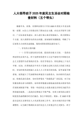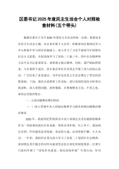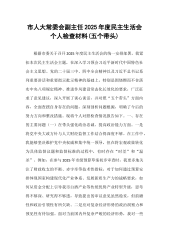 住房和城乡建设局党组书记2025年度民主生活会个人对照检查材料(五个带头)根据本次民主生活会主题要求,本人紧扣深入学习贯彻习近平新时代中国特色社会主义思想,全面贯彻落实党的二十届三中、四中全会精神,深入贯彻落实习近平总书记重要讲话和重要指示批示精神,聚焦高质量发展首要任务,对照中央八项规定及其实施细则精神,对照党的二十届四中全会关于统筹发展和安全、推进城市治理现代化的新要求,结合自身思想、职责和工作实际,深入查摆问题,深刻剖析根源,明确整改方向。现将对照检查情况报告如下。一、存在的主要问题本人严格对照本次民主生活会明确的五个方面重点内容,坚持把自己摆进去、把职责摆进去、把工作摆进去,认真检视反思,查摆出以下突出问题。(一)在带头强化政治忠诚、提高政治能力方面。一是政治判断力的敏锐性有待加强。...