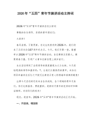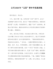 在2026年“五四”青年节表彰大会上的讲话同志们、青年朋友们:春和景明,万物竞发。在这生机盎然的美好时节,我们欢聚一堂,隆重举行2026年"五四"青年节表彰大会。这既是对先进青年典型的隆重表彰和崇高致敬,也是对五四精神的深情回望和自觉赓续,更是对青年成长发展的殷切关注和鼎力支持。在此,我代表[单位/组织名称],向受到表彰的先进集体和优秀个人表示热烈的祝贺!向全市广大青年致以节日的诚挚问候!五四薪火代代传,青春逐梦正当时。107年前,五四运动的熊熊烈火照亮了中华民族觉醒前行的道路;107年后,五四精神已化为流淌在一代代青年血脉中的不竭动力。2026年,是"十四五"规划圆满收官、"十五五"规划谋篇布局的关键之年,改革发展稳定的各项任务艰巨而光荣。我们比以往任何时候都更加需要青年的蓬勃朝气和创新锐...