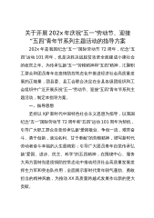 关于开展202x年庆祝“五一”劳动节、迎接“五四”青年节系列主题活动的指导方案202x年是我国纪念“五一”国际劳动节72周年,纪念“五四”运动101周年,也是决胜决战脱贫攻坚全面建成小康社会的收官之年。为传承弘扬“五一”劳模精神和“五四”精神,汇聚职工群众和团员青年在疫情防控常态化中推进经济社会高质量发展的正能量,团县委、县工会联合决定在全县各级团组织和工会组织中广泛开展庆祝“五一”劳动节、迎接“五四”青年节系列主题活动,制定本指导方案。一、指导思想坚持以XJP新时代中国特色社会主义思想为指导,以我国纪念“五一”国际劳动节72周年和“五四”运动101周年为契机,引导广大职工群众自觉传承弘扬“爱...