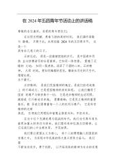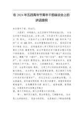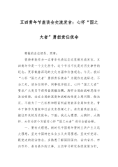 五四青年节座谈会讲稿:永远跟党走、建功新时代,在高质量发展的新征程上勇当先锋同志们:今天上午,我们召开X青年干部员工代表座谈会,热烈庆祝中国共产主义青年团成立102周年,引导激励X广大团员青年干部在实现中华民族伟大复兴中国梦的新征程上奋勇前进,在开创X高质量发展的新局面中勇当先锋。刚才8名青年同志作了非常好的发言,我用16个字作评语:朝气蓬勃、深入思考,勇立潮头,攻坚克难。你们是X青年员工的优秀代表,有这样优秀的年轻同志,我认为X的事业后继有人,大有可为。大家就像习近平总书记所说的那样,让人迎面就能感受到年轻干部应有的清澈和纯粹。X来之不易的成绩,离不开一代代X青年的拼搏进取和无私奉献,你们在...