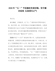 2026年“五一”节前廉政党课讲稿:坚守廉洁底线弘扬清风正气同志们:春风拂面,万物复苏。在“五一”国际劳动节即将来临之际,我们齐聚一堂,共同开展这次节前廉政党课教育。这既是贯彻落实党中央关于全面从严治党战略部署的规定动作,也是结合我区实际、深化党风廉政建设的重要举措,更是向全区广大党员干部发出的“廉洁过节”动员令。2026年是“十五五”规划的开局之年,也是我区推动高质量发展、实现现代化建设新突破的关键之年。年初以来,全区上下紧紧围绕区委中心工作,凝心聚力、攻坚克难,经济社会发展呈现出稳中有进、向好向优的良好态势。然而,越是形势向好,越要保持清醒头脑;越是任务繁重,越要筑牢思想防线。节点即考点,作风就是宣言。“五一”假期不仅是放松身心的时刻,更是对党员干部党性修养和纪律作风的一次重要检验。今天...