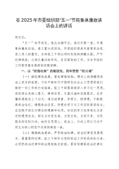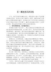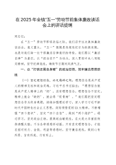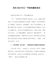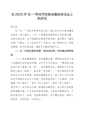 在2025年全镇“五一”劳动节前集体廉政谈话会上的讲话提纲同志们:在“五一”劳动节即将来临之际,我们召开这次集体廉政谈话会,意义重大。“五一”假期是违规违纪行为的高发期,也是对我们每一位干部廉洁自律意识的考验。我们要以“廉洁自律”为基石,以“担当实干”为动力,深入贯彻中央八项规定精神,坚守纪律底线,确保节日期间风清气正。一、以“打铁还需自身硬”的政治觉悟,筑牢廉洁思想防线(一)坚定理想信念,补足精神之钙。理想信念是共产党人的精神支柱和政治灵魂。习近平总书记指出:“理想信念就是共产党人精神上的‘钙’,没有理想信念,理想信念不坚定,精神上就会‘缺钙’,就会得‘软骨病’。”我们要把坚定理想信念作为终...