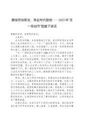 赓续劳动荣光、奔赴时代新程——2025年“五一劳动节”国旗下讲话尊敬的老师、亲爱的同学们:大家好!在这阳光明媚、生机勃勃的日子里,我们即将迎来全世界劳动人民共同的节日——“五一”国际劳动节。今天,我怀着无比崇敬与激动的心情,站在国旗下,与大家一同回顾劳动的伟大意义,展望我们新时代少年的使命与担当。“五一”国际劳动节起源于1886年5月1日美国芝加哥工人大罢工。当时,工人们为了争取八小时工作制,展开了英勇的斗争。他们不怕流血牺牲,用自己的生命和汗水,换来了劳动者的合法权益。这一伟大的工人运动,不仅推动了全球工人阶级的觉醒,更让全世界人民深刻认识到劳动的价值和力量。1889年7月,第二国际宣布将每...