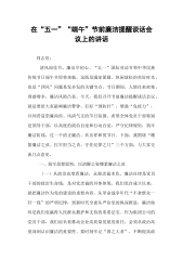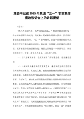 党委书记在2025年集团“五一”节前集体廉政谈话会上的讲话提纲同志们:“清风两袖朝天去,免得闾阎话短长。”廉洁从政是我们每一位干部必须坚守的底线,是党和人民对我们的基本要求,更是我们事业发展的重要保障。“五一”佳节将至,在这个重要的时间节点,我们召开此次集体廉政谈话会,旨在进一步增强大家的廉洁自律意识,筑牢拒腐防变的思想防线,确保大家度过一个风清气正、欢乐祥和的节日。下面,我讲几点意见,与同志们共勉。一、以“悬衡而知平,设规而知圆”的精准思维,强化廉洁意识(一)深刻认识廉洁从政的重要意义。廉洁从政是我们党的优良传统和政治本色。从建党之初,我们党就把廉洁自律作为党员的基本要求,无数革命先辈用自己的实际行动诠释了廉洁奉公的高尚品质。在新时代,廉洁从政更是我们党保持先进性和纯洁性的必然要求,是我们...