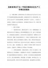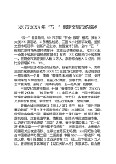 XX省文化和旅游厅关于20XX年五一假期文化和旅游市场情况的报告今年五一假期,在省委、省政府的坚强领导和文化和旅游部的有力指导下,全省文化和旅游系统一手抓安全生产、一手抓服务保障,全力推动假日文化和旅游市场安全平稳、规范有序运行,文化和旅游消费热起来、旺起来。假日期间,全省文化和旅游部门未收到安全生产事故、重大游客投诉、重大网络舆情报告。一、基本情况据大数据测算,五一假期全省共接待游客X万人次、实现旅游消费总额X亿元,同比分别增长X%、X%。全省纳入统计的X家A级旅游景区五天累计接待游客X万人次、门票收入X万元,同比分别增长X%、X%。全省图书馆、文化馆、博物馆累计接待群众X万人次。二、主要特...