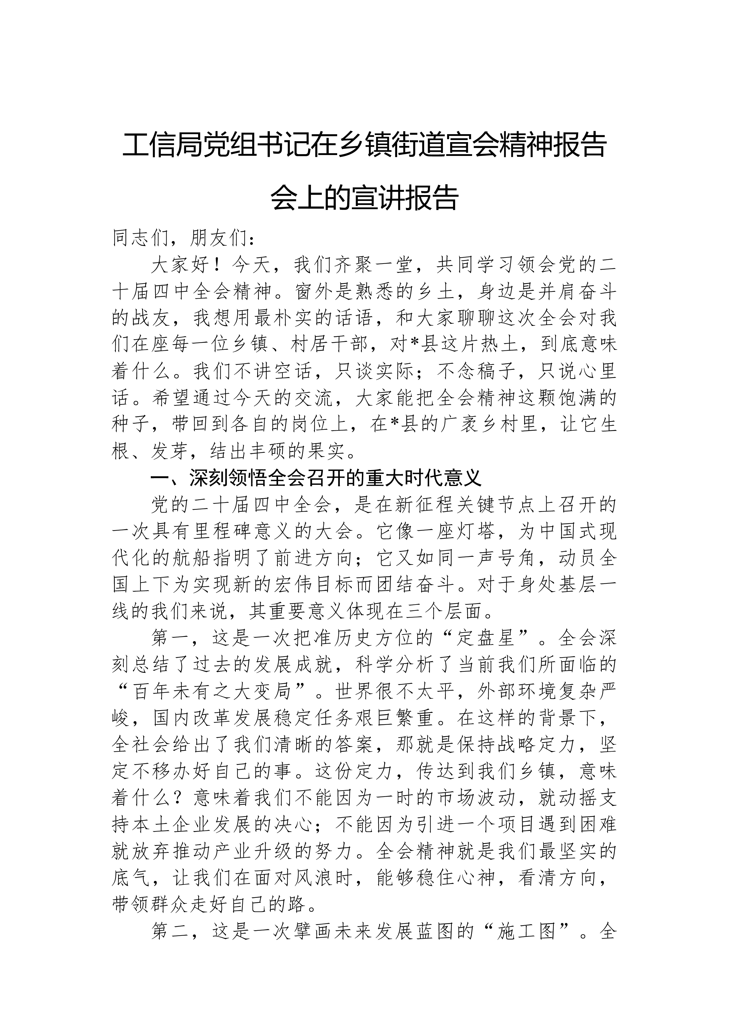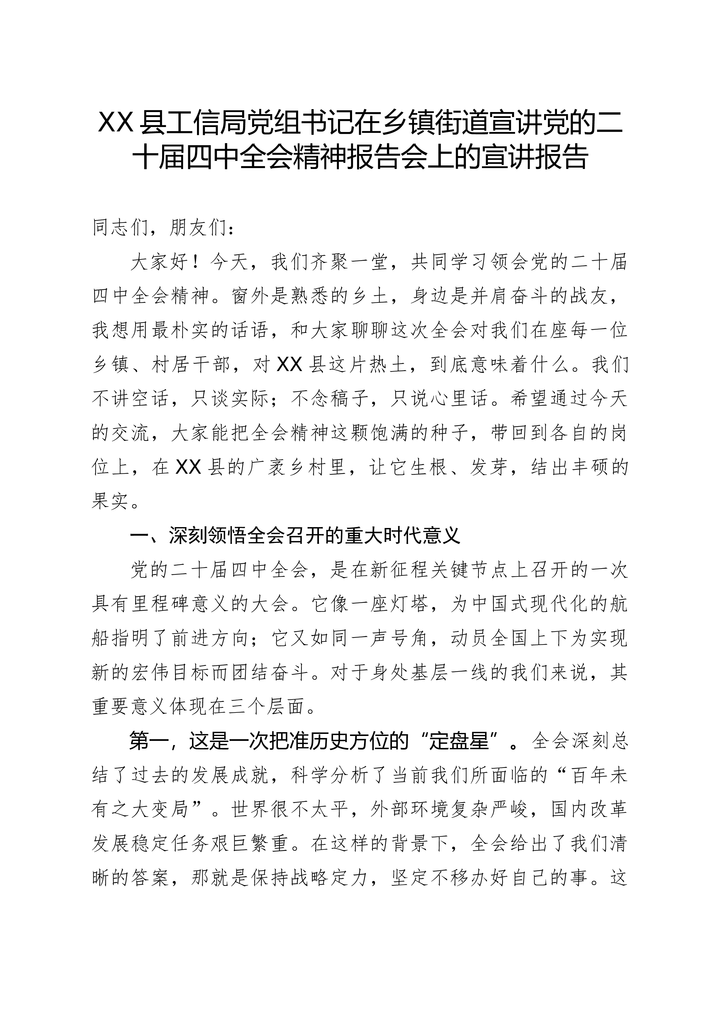 XX县工信局党组书记在乡镇街道宣讲党的二十届四中全会精神报告会上的宣讲报告同志们,朋友们:大家好!今天,我们齐聚一堂,共同学习领会党的二十届四中全会精神。窗外是熟悉的乡土,身边是并肩奋斗的战友,我想用最朴实的话语,和大家聊聊这次全会对我们在座每一位乡镇、村居干部,对XX县这片热土,到底意味着什么。我们不讲空话,只谈实际;不念稿子,只说心里话。希望通过今天的交流,大家能把全会精神这颗饱满的种子,带回到各自的岗位上,在XX县的广袤乡村里,让它生根、发芽,结出丰硕的果实。一、深刻领悟全会召开的重大时代意义党的二十届四中全会,是在新征程关键节点上召开的一次具有里程碑意义的大会。它像一座灯塔,为中国式现代化的航船指明了前进方向;它又如同一声号角,动员全国上下为实现新的宏伟目标而团结奋斗。对于身处基层一...