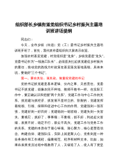 组织部长乡镇街道党组织书记乡村振兴主题培训班讲话提纲同志们:今天,全市乡镇(街道)党(工)委书记乡村振兴主题培训班开班了,首先,我代表市委组织向大家表示欢迎。加强农村基层党建,村党组织是”龙身”,乡镇党委是”龙头”。党委书记作为”一线施工队长”,必须坚决扛起抓党建促乡村振兴的重任,推动党的路线方针政策在基层落实落地落细。具体来说,要做好”三个书记”。第一,要在其位、谋其政,做重视党建的书记党的书记抓党建是基本逻辑、分内之事、天然责任。党委书记不抓党建,就像农民不种地、教师不教书一样。在实际工作中,要正确认识和把握”两个关系”。党建工作与中心工作的关系。抓党建与抓经济、抓发展不是对立的、割裂的,...
