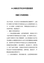 X乡镇社区书记关于2022年度抓基层党建工作述职报告2022年以来,×社区在×镇党委政府的正确领导下,认真学习贯彻习近平新时代中国特色社会主义思想和党的十九大、XX大精神,以党建为引领,不断推进社区各项中心工作有序开展。现述职如下:一、履职工作特色和亮点(一)强化思想政治建设,提升教育素养。持续深入学习习近平新时代中国特色社会主义思想、XX大精神20余次,认真学习贯彻“五个更大”重要要求,深入贯彻落实习近平总书记视察×省重要讲话和对×省工作系列重要指示精神情况;坚持用习近平新时代中特色社会主义思想武装头脑,持续提升政治判断力、政治领悟力、政治执行力采取“线上+线下”如学习强国、主题党日活动等方...