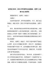 在学校2020-2021学年度学生先进集体、优秀个人表彰大会上的讲话亲爱的同学们、老师们、校友们:大家好!九秩芳华始为序,百年伟业逐梦来。今天,我们在这里集会,表彰2020-2021学年度学生先进集体、优秀个人。首先,我代表学校向全体同学表示亲切的问候,向荣获表彰的集体和个人表示热烈的祝贺,向潜心育人、长期奋战在人才培养一线的广大教职工表示崇高的敬意,向一直关心、支持学弟学妹成长和母校建设发展的校友们表示衷心的感谢!同学们、老师们、校友们,2021年是中国共产党成立xx周年,是XX大学建校90周年。2021年,也是我校办学历程中极不平凡的一年。在庆祝建校90周年之际,我们无比欣喜地收到了中共中...